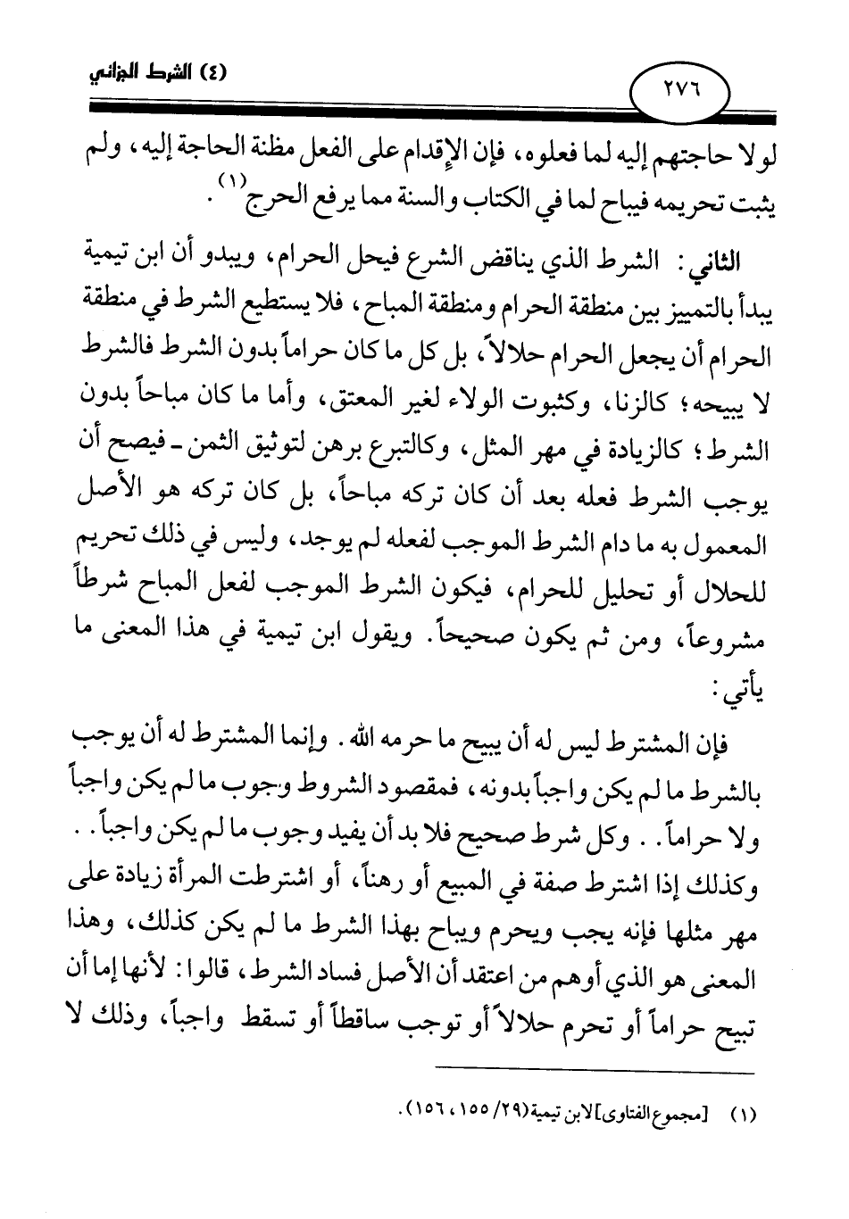 الثاني: الشرط الذي يناقض الشرع فيحل الحرام، ويبدو أن ابن تيمية يبدأ بالتمييز بين منطقة الحرام ومنطقة المباح، فلا يستطيع الشرط في منطقة الحرام أن يجعل الحرام حلالا، بل كل ما كان حراما بدون الشرط فالشرط لا يبيحه، كالزنا، وكثبوت الولاء لغير المعتق، وأما ما كان مباحا بدون الشرط؛ كالزيادة في مهر المثل، وكالتبرع برهن لتوثيق الثمن- فيصح أن يوجب الشرط فعله بعد أن كان تركه مباحا، بل كان تركة هو الأصل المعمول به ما دام الشرط الموجب لفعله لم يوجد، وليس في ذلك تحريم للحلال أو تحليل للحرام، فيكون الشرط الموجب لفعل المباح شرطا مشروعا، ومن ثم يكون صحيحا. ويقول ابن تيمية في هذا المعنى ما يأتي: