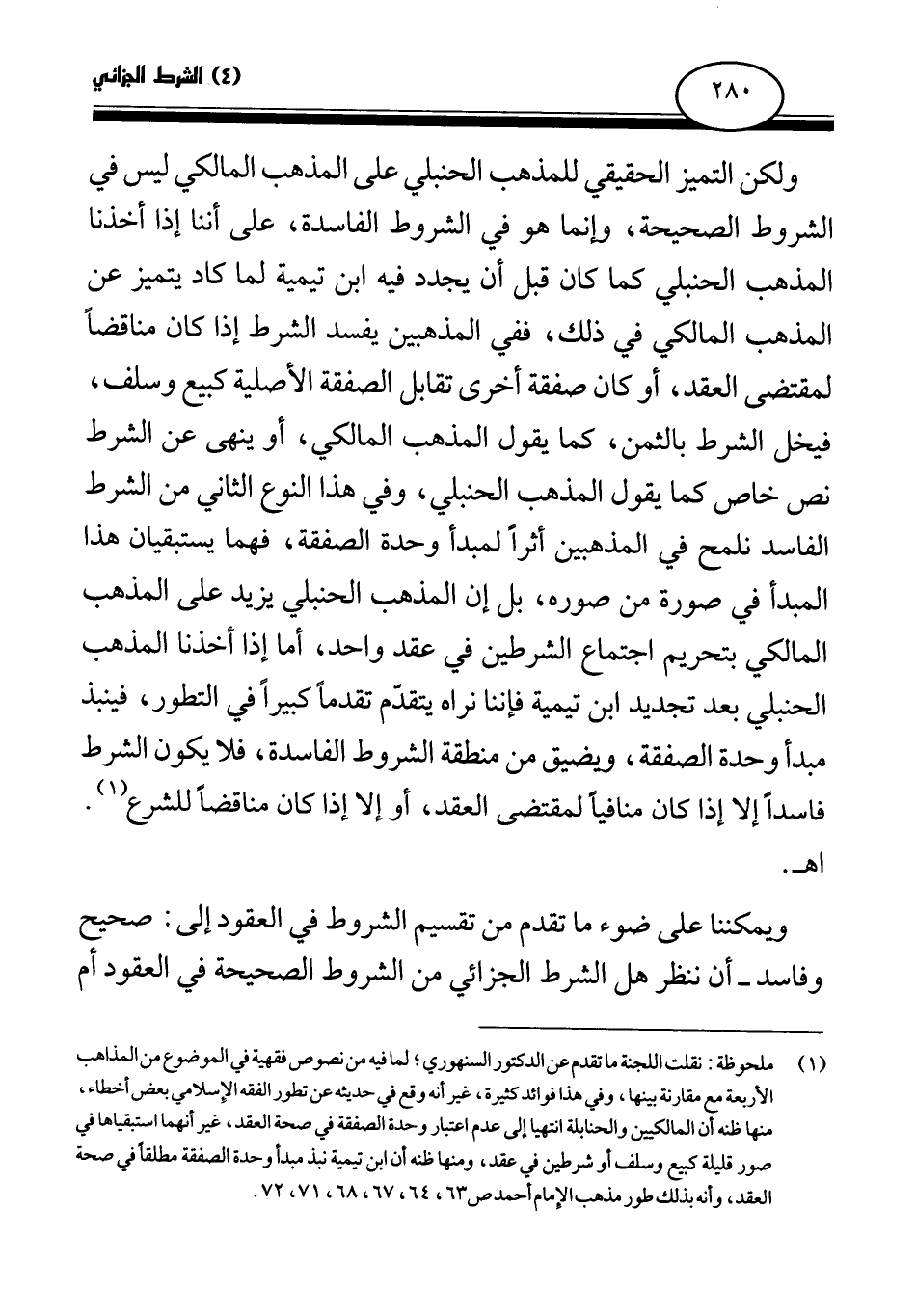 أما إذا أخذنا المذهب الحنبلي بعد تجديد ابن تيمية فإننا نراه يتقدم تقدما كبيرا في التطور، فينبذ مبدأ وحدة الصفقة، ويضيق من منطقة الشروط الفاسدة، فلا يكون الشرط فاسدا إلا إذا كان منافيا لمقتضى العقد، أو إلا إذا كان مناقضا للشرع. اهـ.