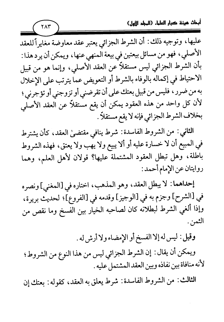 عليها، وتوجيه ذلك: أن الشرط الجزائي يعتبر عقد معاوضة مغاير للعقد الأصلي، فهو من مسائل بيعتين في بيعة المنهي عنها، ويمكن أن يرد هذا: بأن الشرط الجزائي ليس مستقلا عن العقد الأصلي، وإنما هو من قبيل الاحتياط في إكماله بالوفاء بالشرط أو التعويض عما يترتب على الإخلال به من ضرر، فليس من قبيل بعتك على أن تقرضني أو تزوجني أو تؤجرني؛ لأن كل واحد من هذه العقود يمكن أن يقع مستقلا عن العقد الأصلي بخلاف الشرط الجزائي فإنه لا يقع مستقلا.