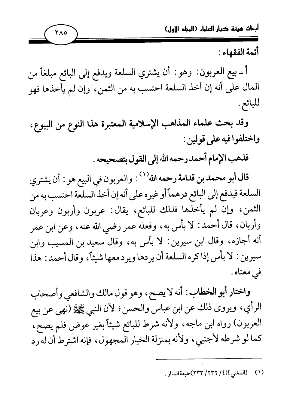 قال أبو محمد بن قدامة رحمه الله (¬1) : والعربون في البيع هو: أن يشتري السلعة فيدفع إلى البائع درهما أو غيره على أنه إن أخذ السلعة احتسب به من الثمن، وإن لم يأخذها فذلك للبائع، يقال: عربون وأربون وعربان وأربان، قال أحمد: لا بأس به، وفعله عمر رضي الله عنه، وعن ابن عمر أنه أجازه، وقال ابن سيرين: لا بأس به، وقال سعيد بن المسيب وابن سيرين: لا بأس إذا كره السلعة أن يردها ويرد معها شيئا، وقال أحمد: هذا في معناه.