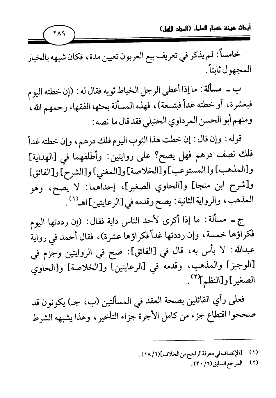 ج- مسألة: ما إذا أكرى لأحد الناس دابة فقال: (إن رددتها اليوم فكراؤها خمسة، وإن رددتها غدا فكراؤها عشرة) ، فقال أحمد في رواية عبد الله: لا بأس به، قال في [الفائق] : صح في الروايتين وجزم في [الوجيز] والمذهب، وقدمه في [الرعايتين] ، و [الخلاصة] ، و [الحاوي الصغير] ، و [النظم] (¬2) .