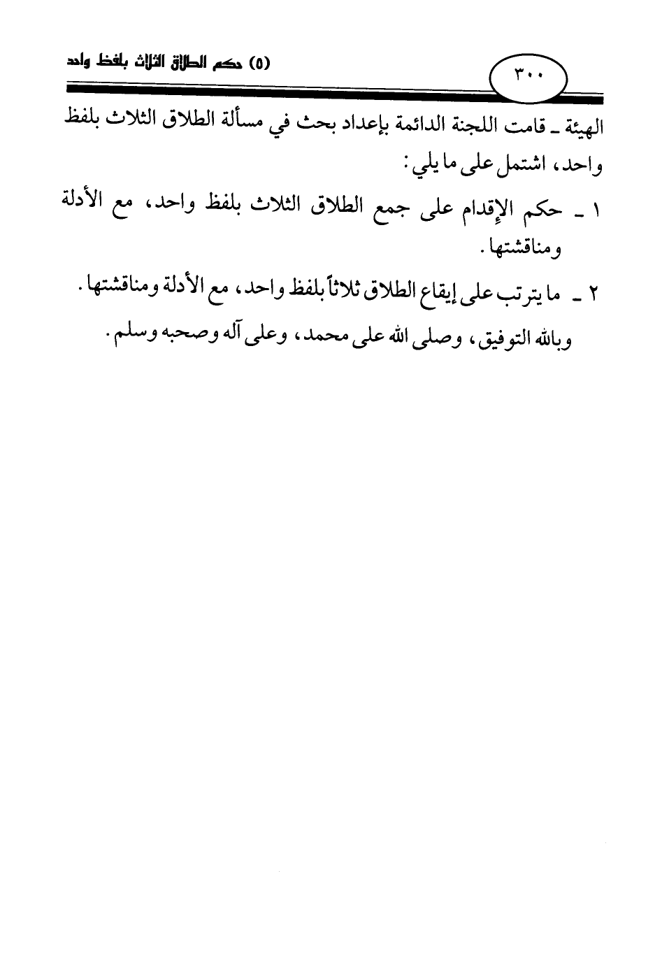 الهيئة- قامت اللجنة الدائمة بإعداد بحث في مسألة الطلاق الثلاث بلفظ واحد، اشتمل على ما يلي: