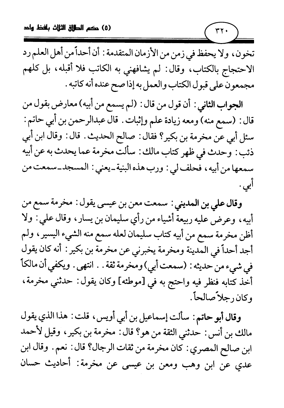 الجواب الثاني: أن قول من قال: (لم يسمع من أبيه) معارض بقول من قال: (سمع منه) ومعه زيادة علم وإثبات. قال عبد الرحمن بن أبي حاتم: سئل أبي عن مخرمة بن بكير؟ فقال: صالح الحديث. قال: وقال ابن أبي ذئب: وحدث في ظهر كتاب مالك: سألت مخرمة عما يحدث به عن أبيه سمعها من أبيه، فحلف لي: ورب هذه البنية- يعني: المسجد- سمعت من أبي.