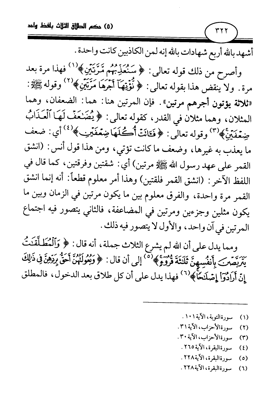 وأصرح من ذلك قوله تعالى: {سَنُعَذِّبُهُمْ مَرَّتَيْنِ} (¬1) فهذا مرة بعد مرة. ولا ينقض هذا بقوله تعالى: {نُؤْتِهَا أَجْرَهَا مَرَّتَيْنِ} (¬2) وقوله صلى الله عليه وسلم: «ثلاثة يؤتون أجرهم مرتين (¬3) » . فإن المرتين هنا: هما: الضعفان، وهما المثلان، وهما مثلان في القدر، كقوله تعالى: {يُضَاعَفْ لَهَا الْعَذَابُ ضِعْفَيْنِ} (¬4) وقوله تعالى: {فَآتَتْ أُكُلَهَا ضِعْفَيْنِ} (¬5) أي: ضعف ما يعذب به غيرها، وضعف ما كانت تؤتي، ومن هذا قول أنس: «انشق القمر على عهد رسول الله صلى الله عليه وسلم مرتين (¬6) » أي: شقتين وفرقتين، كما قال في اللفظ الآخر: «انشق القمر فلقتين (¬7) » وهذا أمر معلوم قطعا: أنه إنما انشق القمر مرة واحدة، والفرق معلوم بين ما يكون مرتين في الزمان وبين ما يكون مثلين وجزءين ومرتين في المضاعفة، فالثاني يتصور فيه اجتماع المرتين في آن واحد، والأول لا يتصور فيه ذلك.
