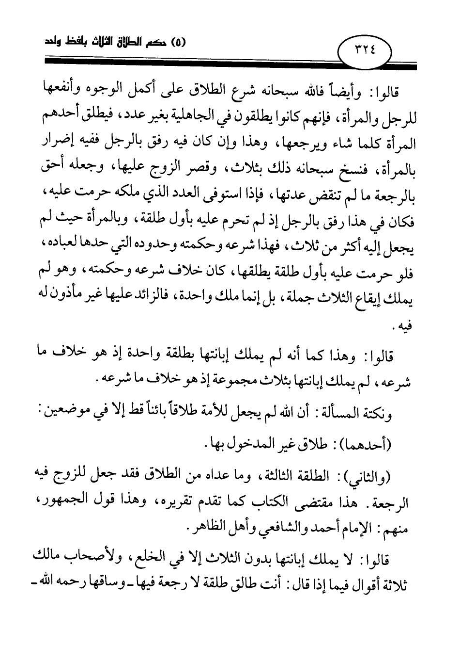 قالوا: وهذا كما أنه لم يملك إبانتها بطلقة واحدة إذ هو خلاف ما شرعه، لم يملك إبانتها بثلاث مجموعة إذ هو خلاف ما شرعه.
