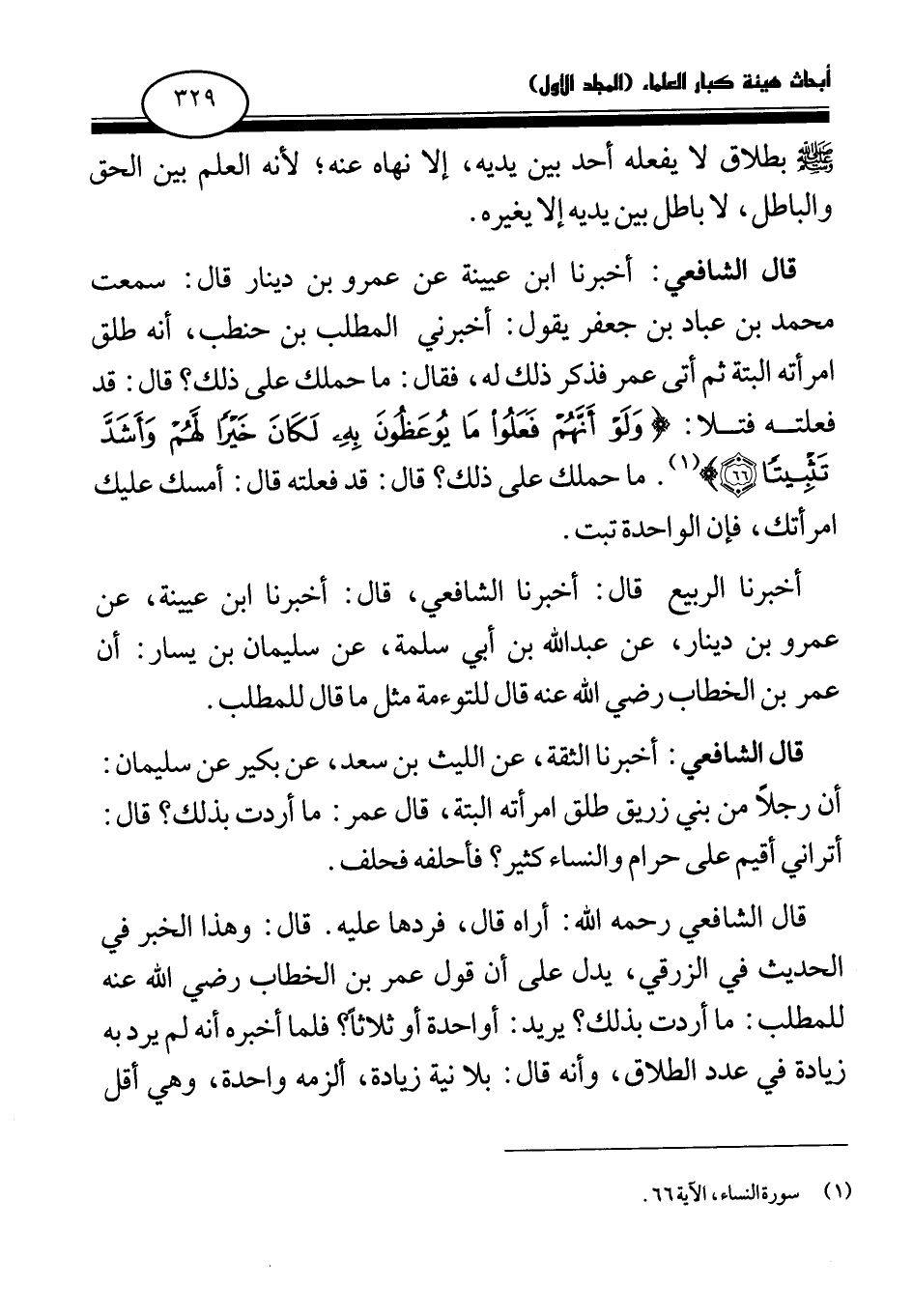 قال الشافعي: أخبرنا ابن عيينة عن عمرو بن دينار قال: سمعت محمد بن عباد بن جعفر يقول: أخبرني المطلب بن حنطب، أنه طلق امرأته البتة ثم أتى عمر فذكر ذلك له، فقال: ما حملك على ذلك؟ قال: قد فعلته فتلا: {وَلَوْ أَنَّهُمْ فَعَلُوا مَا يُوعَظُونَ بِهِ لَكَانَ خَيْرًا لَهُمْ وَأَشَدَّ تَثْبِيتًا} (¬1) ما حملك على ذلك؟ قال: قد فعلته قال: أمسك عليك امرأتك، فإن الواحدة تبت.
