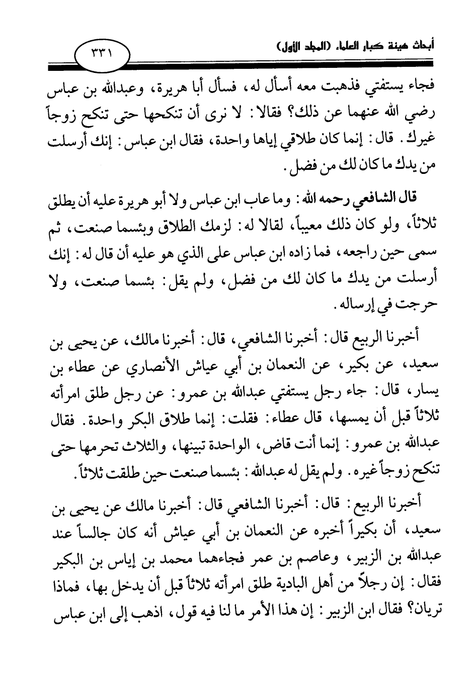 أخبرنا الربيع: قال: أخبرنا الشافعي قال: أخبرنا مالك عن يحيى بن سعيد، أن بكيرا أخبره عن النعمان بن أبي عياش أنه كان جالسا عند عبد الله بن الزبير، وعاصم بن عمر فجاءهما محمد بن إياس بن البكير فقال: إن رجلا من أهل البادية طلق امرأته ثلاثا قبل أن يدخل بها، فماذا تريان؟ فقال ابن الزبير: إن هذا الأمر ما لنا فيه قول، اذهب إلى ابن عباس