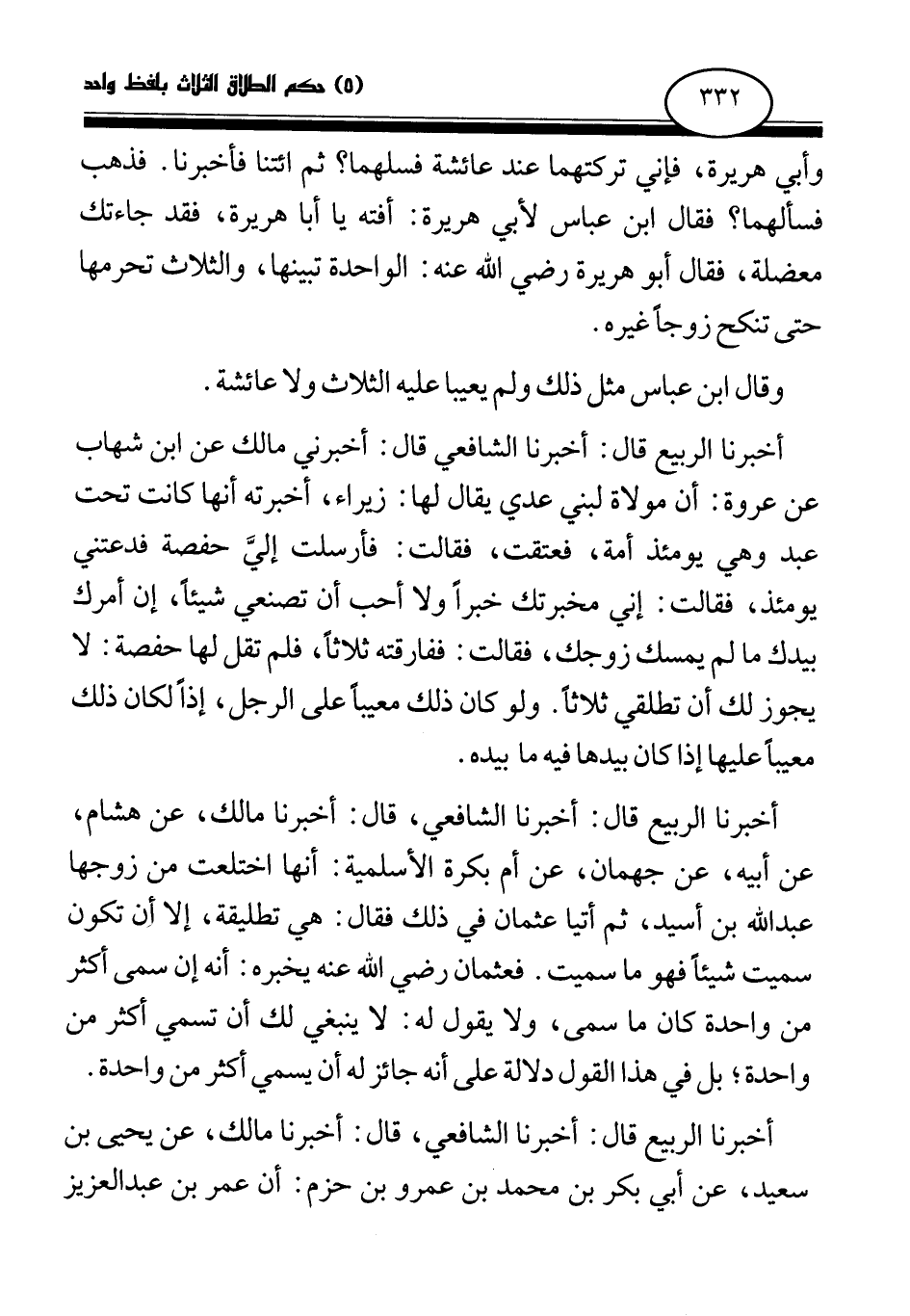 أخبرنا الربيع قال: أخبرنا الشافعي قال: أخبرني مالك عن ابن شهاب عن عروة: أن مولاة لبني عدي يقال لها: زيراء، أخبرته أنها كانت تحت عبد وهي يومئذ أمة، فعتقت، فقالت: فأرسلت إلي حفصة فدعتني يومئذ، فقالت: إني مخبرتك خبرا ولا أحب أن تصنعي شيئا، إن أمرك بيدك ما لم يمسك زوجك، فقالت: ففارقته ثلاثا، فلم تقل لها حفصة: لا يجوز لك أن تطلقي ثلاثا. ولو كان ذلك معيبا على الرجل، إذا لكان ذلك معيبا عليها إذا كان بيدها فيه ما بيده.