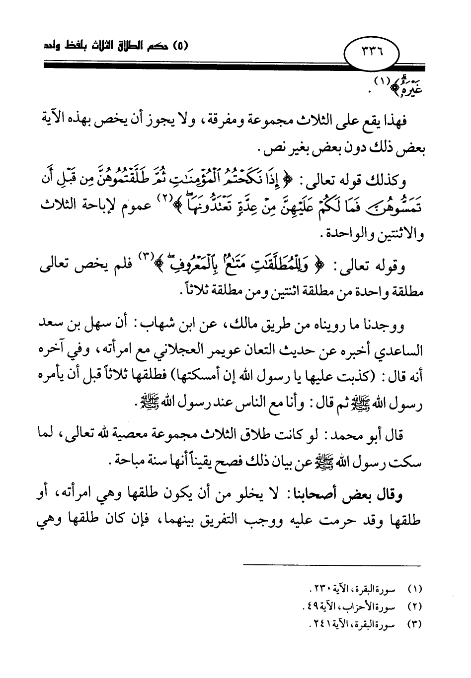 وكذلك قوله تعالى: {إِذَا نَكَحْتُمُ الْمُؤْمِنَاتِ ثُمَّ طَلَّقْتُمُوهُنَّ مِنْ قَبْلِ أَنْ تَمَسُّوهُنَّ فَمَا لَكُمْ عَلَيْهِنَّ مِنْ عِدَّةٍ تَعْتَدُّونَهَا} (¬1) عموم لإباحة الثلاث والاثنتين والواحدة. وقوله تعالى: {وَلِلْمُطَلَّقَاتِ مَتَاعٌ بِالْمَعْرُوفِ} (¬2) فلم يخص تعالى مطلقة واحدة من مطلقة اثنتين ومن مطلقة ثلاثا.