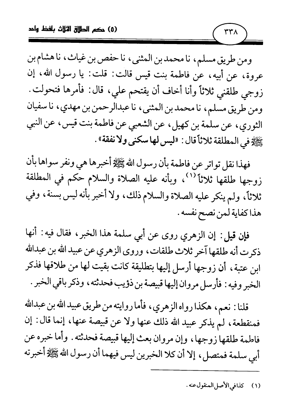 فهذا نقل تواتر عن فاطمة بأن رسول الله صلى الله عليه وسلم أخبرها هي ونفر سواها بأن زوجها طلقها ثلاثا (¬3) ، وبأنه عليه الصلاة والسلام حكم في المطلقة ثلاثا، ولم ينكر عليه الصلاة والسلام ذلك، ولا أخبر بأنه ليس بسنة، وفي هذا كفاية لمن نصح نفسه.