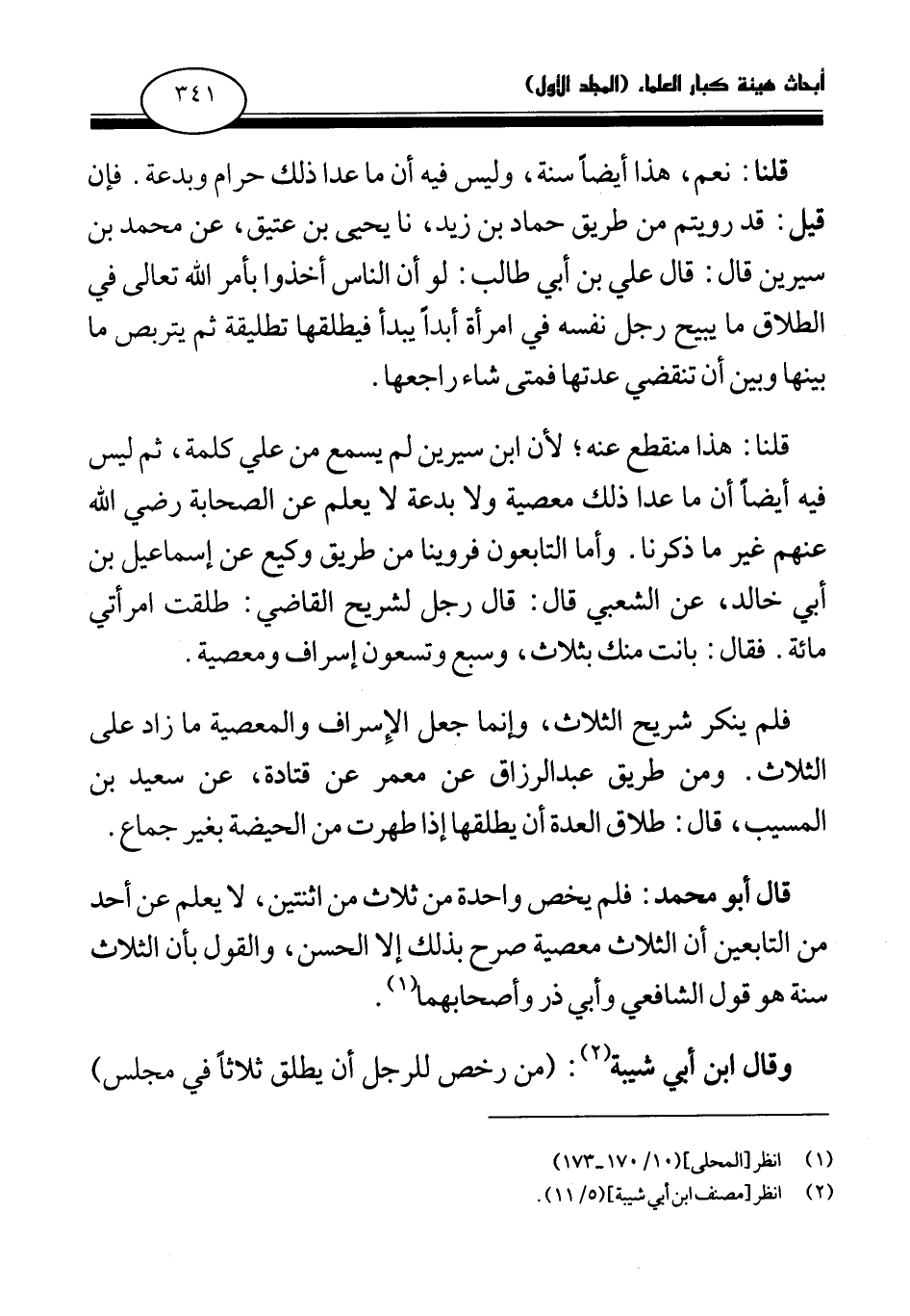 قلنا: نعم، هذا أيضا سنة، وليس فيه أن ما عدا ذلك حرام وبدعة. فإن قيل: قد رويتم من طريق حماد بن زيد، نا يحيى بن عتيق، عن محمد بن سيرين قال: قال علي بن أبي طالب: لو أن الناس أخذوا بأمر الله تعالى في الطلاق ما يبيح رجل نفسه في امرأة أبدا يبدأ فيطلقها تطليقة ثم يتربص ما بينها وبين أن تنقضي عدتها فمتى شاء راجعها.