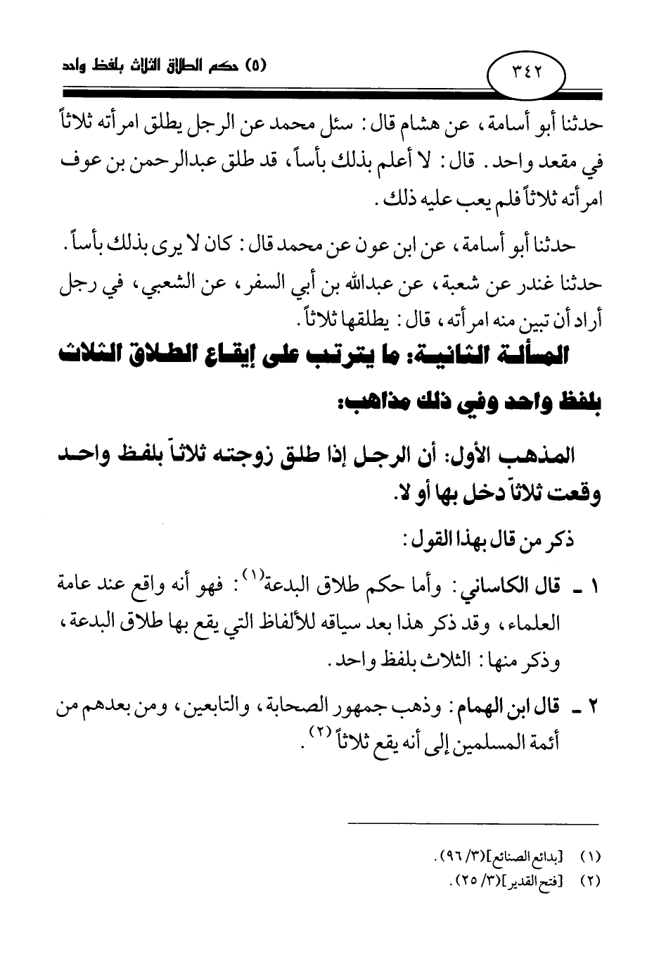 1 - قال الكاساني: وأما حكم طلاق البدعة (¬1) : فهو أنه واقع عند عامة العلماء، وقد ذكر هذا بعد سياقه للألفاظ التي يقع بها طلاق البدعة، وذكر منها: الثلاث بلفظ واحد.