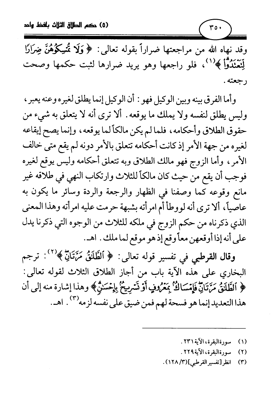وقال القرطبي في تفسير قوله تعالى: {الطَّلَاقُ مَرَّتَانِ} (¬2) ترجم البخاري على هذه الآية باب من أجاز الطلاق الثلاث لقوله تعالى: {الطَّلَاقُ مَرَّتَانِ فَإِمْسَاكٌ بِمَعْرُوفٍ أَوْ تَسْرِيحٌ بِإِحْسَانٍ} (¬3) وهذا إشارة منه إلى أن هذا التعديد إنما هو فسحة لهم فمن ضيق على نفسه لزمه (¬4) اهـ.