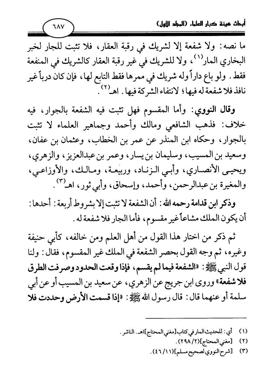 وقال النووي: وأما المقسوم فهل تثبت فيه الشفعة بالجوار، فيه خلاف: فذهب الشافعي ومالك وأحمد وجماهير العلماء لا تثبت بالجوار، وحكاه ابن المنذر عن عمر بن الخطاب، وعثمان بن عفان، وسعيد بن المسيب، وسليمان بن يسار، وعمر بن عبد العزيز، والزهري، ويحيى الأنصاري، وأبي الزناد، وربيعة، ومالك، والأوزاعي، والمغيرة بن عبد الرحمن، وأحمد، وإسحاق، وأبي ثور، اهـ (¬3) .