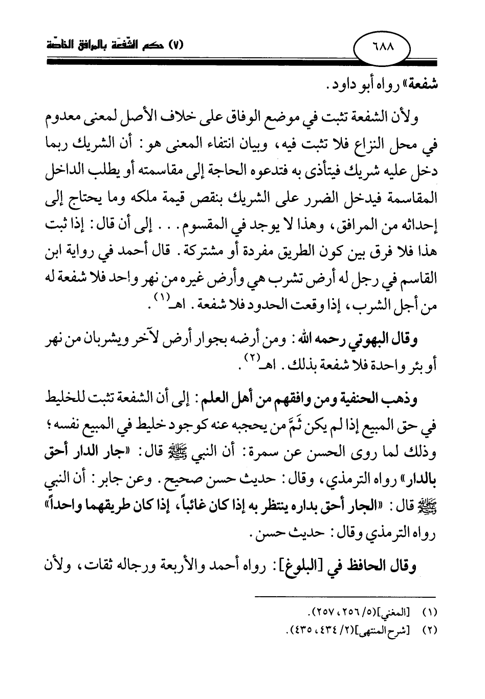 ولأن الشفعة تثبت في موضع الوفاق على خلاف الأصل لمعنى معدوم في محل النزاع فلا تثبت فيه، وبيان انتفاء المعنى هو: أن الشريك ربما دخل عليه شريك فيتأذى به فتدعوه الحاجة إلى مقاسمته أو يطلب الداخل المقاسمة فيدخل الضرر على الشريك بنقص قيمة ملكه وما يحتاج إلى إحداثه من المرافق، وهذا لا يوجد في المقسوم. . . إلى أن قال: إذا ثبت هذا فلا فرق بين كون الطريق مفردة أو مشتركة. قال أحمد في رواية ابن القاسم في رجل له أرض تشرب هي وأرض غيره من نهر واحد فلا شفعة له من أجل الشرب، إذا وقعت الحدود فلا شفعة. اهـ (¬2) .
