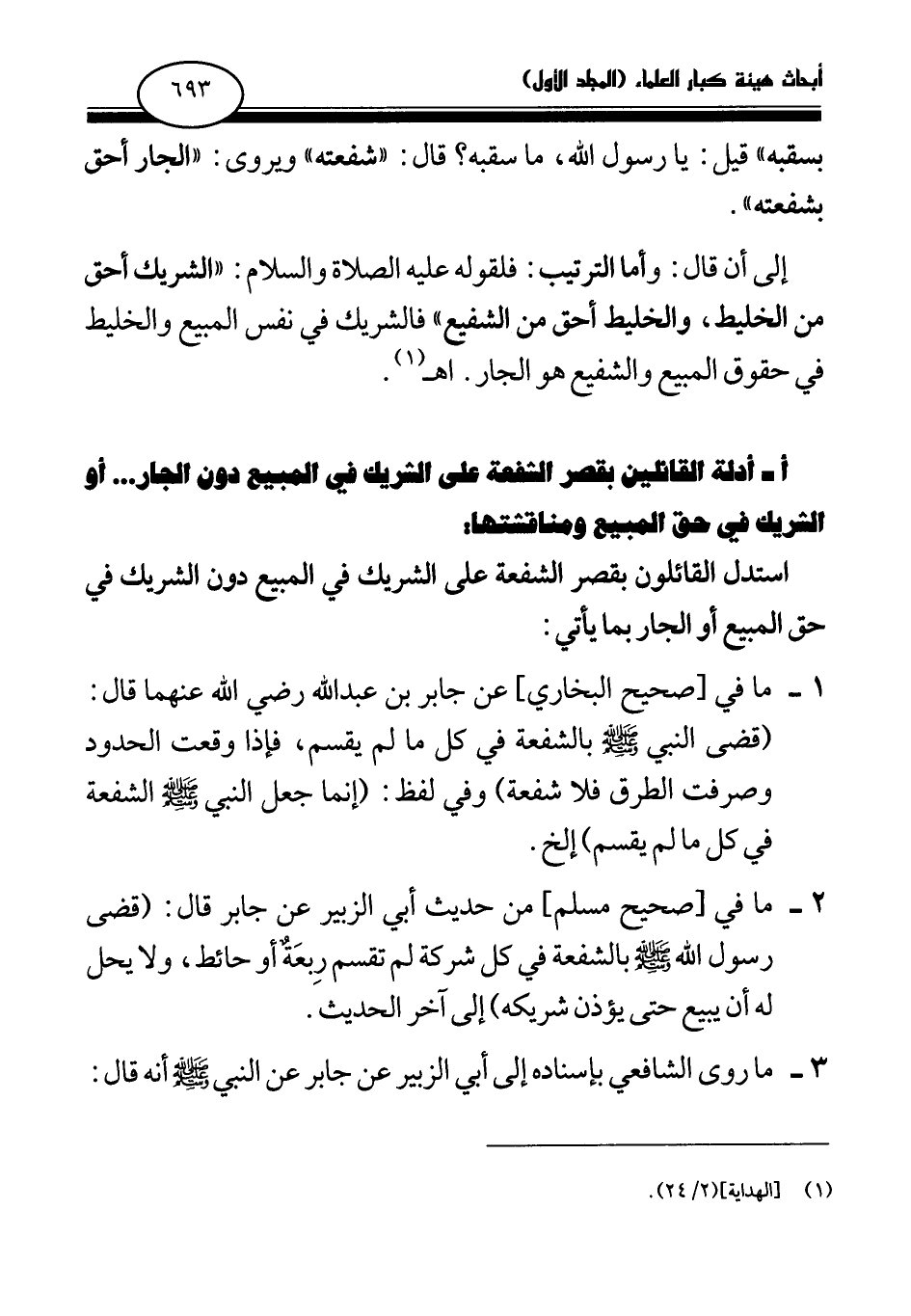 1 - ما في [صحيح البخاري] عن جابر بن عبد الله - رضي الله عنهما - قال: «قضى النبي صلى الله عليه وسلم بالشفعة في كل ما لم يقسم، فإذا وقعت الحدود وصرفت الطرق فلا شفعة (¬1) » وفي لفظ: «إنما جعل النبي صلى الله عليه وسلم الشفعة في كل ما لم يقسم (¬2) » إلخ.