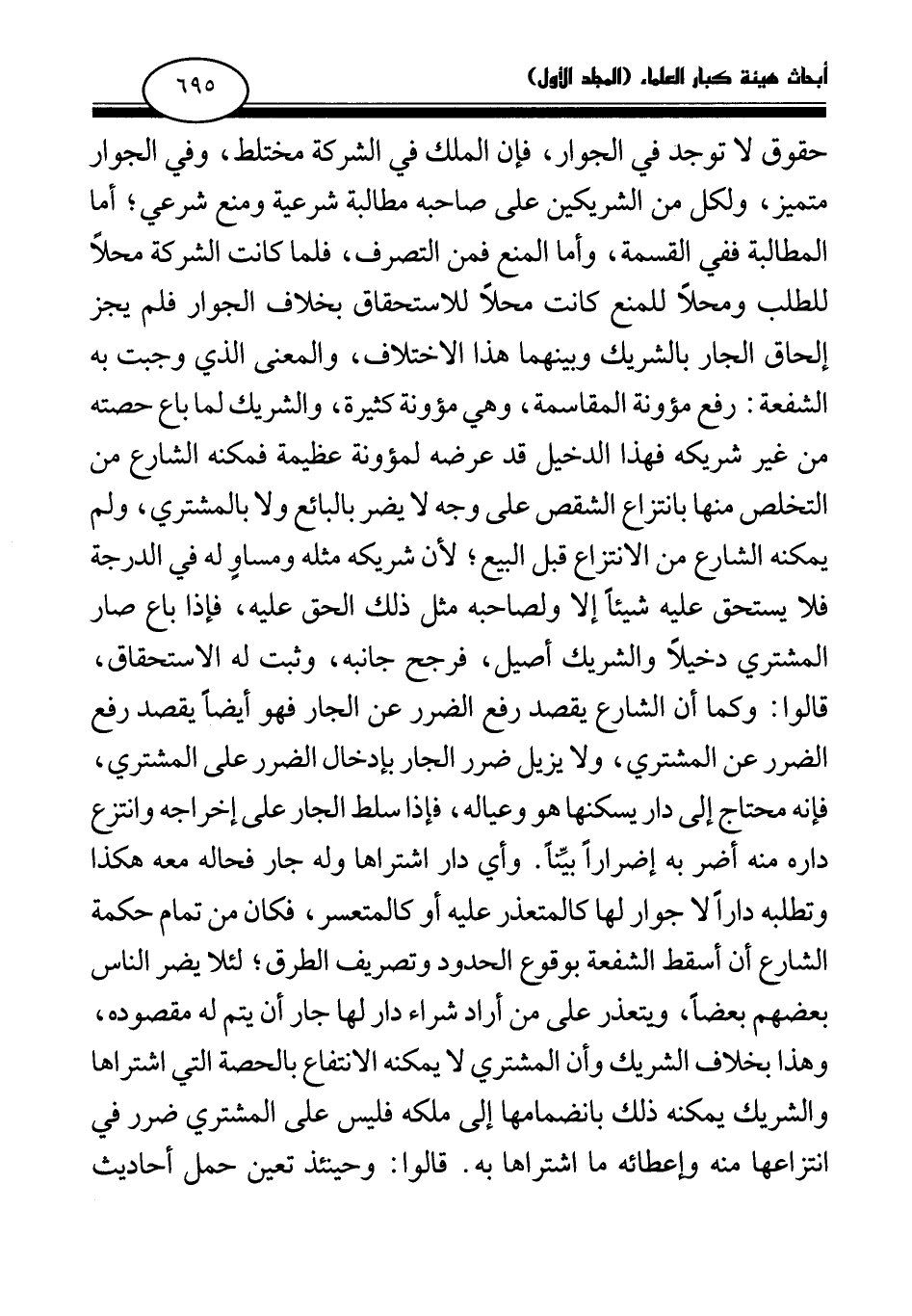 حقوق لا توجد في الجوار، فإن الملك في الشركة مختلط، وفي الجوار متميز، ولكل من الشريكين على صاحبه مطالبة شرعية ومنع شرعي؛ أما المطالبة ففي القسمة، وأما المنع فمن التصرف، فلما كانت الشركة محلا للطلب ومحلا للمنع كانت محلا للاستحقاق بخلاف الجوار؛ فلم يجز إلحاق الجار بالشريك وبينهما هذا الاختلاف، والمعنى الذي وجبت به الشفعة: رفع مئونة المقاسمة، وهي مئونة كثيرة، والشريك لما باع حصته من غير شريكه فهذا الدخيل قد عرضه لمئونة عظيمة فمكنه الشارع من التخلص منها بانتزاع الشقص على وجه لا يضر بالبائع ولا بالمشتري، ولم يمكنه الشارع من الانتزاع قبل البيع؛ لأن شريكه مثله ومساو له في الدرجة فلا يستحق عليه شيئا إلا ولصاحبه مثل ذلك الحق عليه، فإذا باع صار المشتري دخيلا والشريك أصيلا، فرجح جانبه، وثبت له الاستحقاق، قالوا: