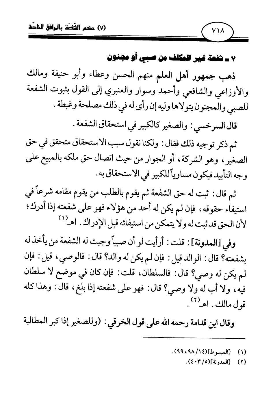 وفي [المدونة] : قلت: أرأيت لو أن صبيا وجبت له الشفعة من يأخذ له بشفعته؟ قال: الوالد، قيل: فإن لم يكن له والد؟ قال: فالوصي، قيل: فإن لم يكن له وصي؟ قال: فالسلطان، قلت: فإن كان في موضع لا سلطان فيه، ولا أب له ولا وصي؟ قال: فهو على شفعته إذا بلغ، قال: وهذا كله قول مالك. اهـ (¬2) .