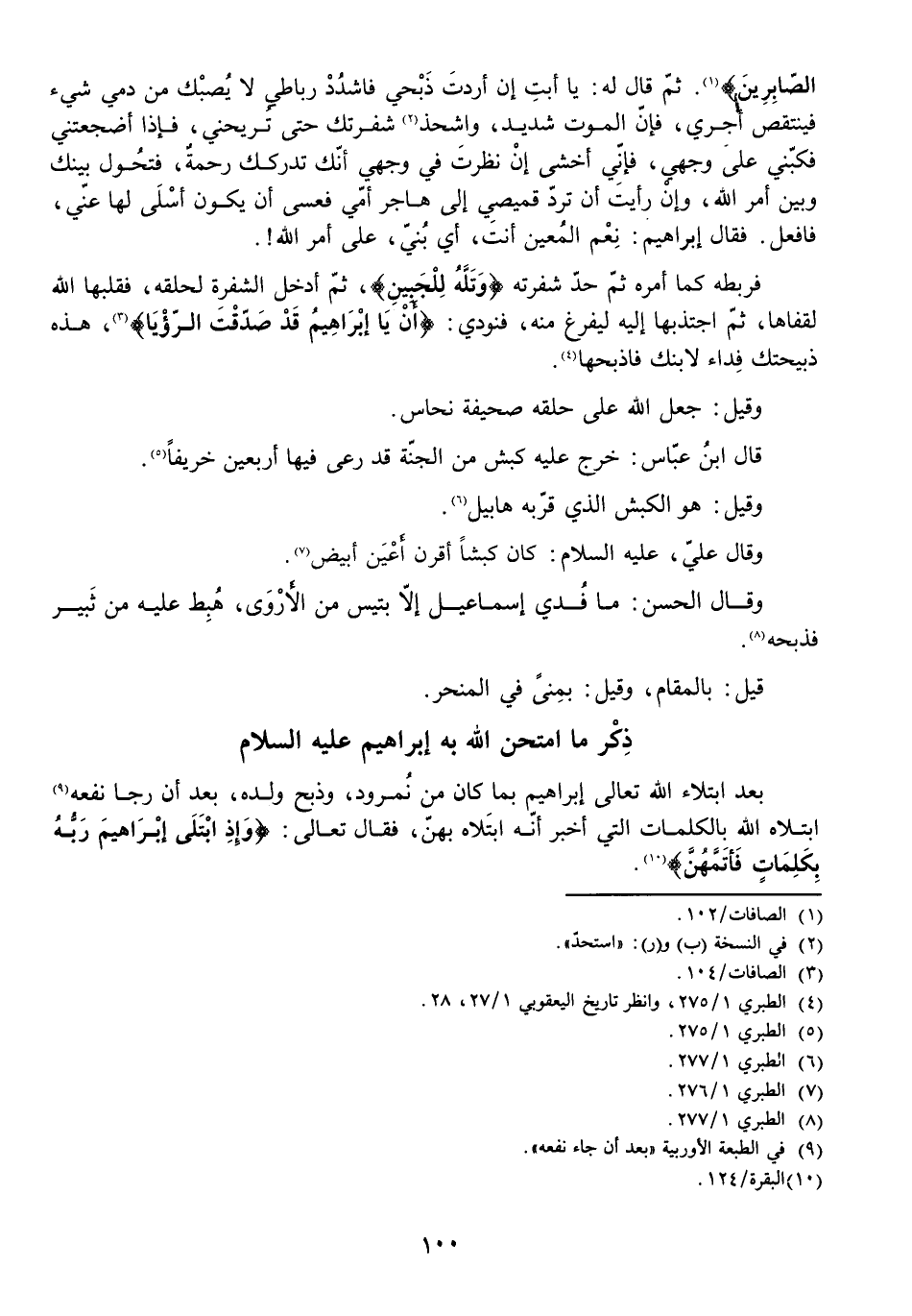 ثُمَّ قَالَ لَهُ يَا أَبَتِ إِنْ أَرَدْتَ ذَبْحِي فَاشْدُدْ رِبَاطِي لَا يُصِبْكَ مِنْ دَمِي شَيْءٌ فَيَنْتَقِصَ أَجْرِي، فَإِنَّ الْمَوْتَ شَدِيدٌ، وَاشَحَذْ شَفْرَتَكَ حَتَّى تُرِيحَنِي، فَإِذَا أَضْجَعْتَنِي فَكُبَّنِي عَلَى وَجْهِي فَإِنِّي أَخْشَى إِنْ نَظَرْتَ فِي وَجْهِي أَنَّكَ تُدْرِكُ رَحْمَةً فَتَحُولُ بَيْنَكَ وَبَيْنَ أَمْرِ اللَّهِ، وَإِنْ رَأَيْتَ أَنْ تَرُدَّ قَمِيصِي إِلَى هَاجَرَ أُمِّي فَعَسَى أَنْ يَكُونَ أَسْلَى لَهَا عَنِّي، فَافْعَلْ. فَقَالَ إِبْرَاهِيمُ: نِعْمَ الْمُعِينُ أَنْتَ، أَيْ بُنَيَّ، عَلَى أَمْرِ اللَّهِ!