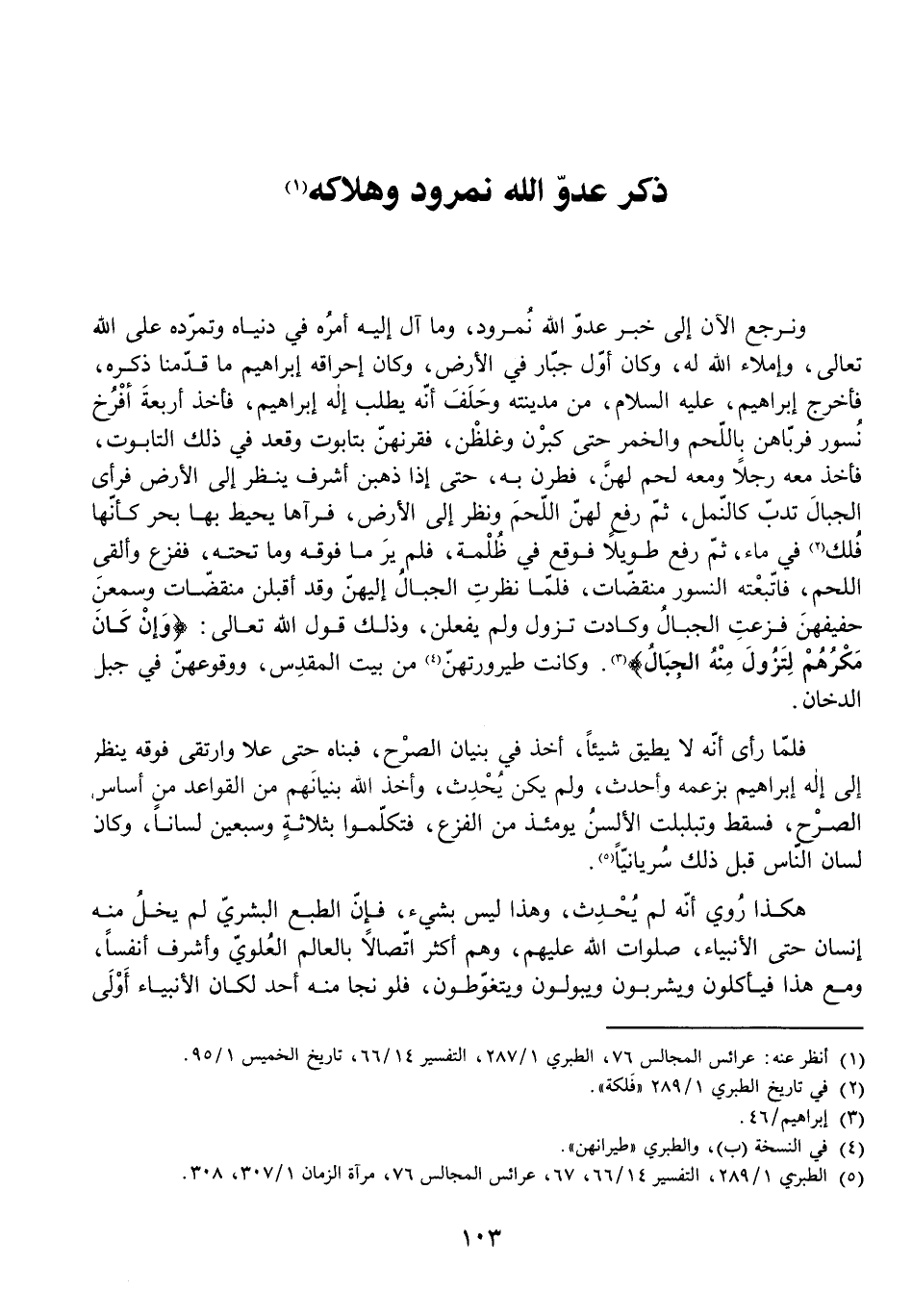 وَنَرْجِعُ الْآنَ إِلَى خَبَرِ عَدُوِّ اللَّهِ نُمْرُودَ، وَمَا آلَ إِلَيْهِ أَمْرُهُ فِي دُنْيَاهُ، وَتَمَرُّدِهِ عَلَى اللَّهِ تَعَالَى، وَإِمْلَاءِ اللَّهِ لَهُ، وَكَانَ أَوَّلَ جَبَّارٍ فِي الْأَرْضِ، وَكَانَ إِحْرَاقُهُ إِبْرَاهِيمَ مَا قَدَّمْنَا ذِكْرَهُ، فَأَخْرَجَ إِبْرَاهِيمَ - عَلَيْهِ السَّلَامُ - مِنْ مَدِينَتِهِ وَحَلَفَ أَنَّهُ يَطْلُبُ إِلَهَ إِبْرَاهِيمَ، فَأَخَذَ أَرْبَعَةَ أَفْرُخِ نُسُورٍ فَرَبَّاهُنَّ بِاللَّحْمِ، وَالْخَمْرِ حَتَّى كَبِرْنَ، وَغَلُظْنَ، فَقَرَنَهُنَّ بِتَابُوتٍ وَقَعَدَ فِي ذَلِكَ التَّابُوتِ فَأَخَذَ مَعَهُ رَجُلًا وَمَعَهُ لَحْمٌ لَهُنَّ، فَطِرْنَ بِهِ حَتَّى إِذَا ذَهَبْنَ أَشْرَفَ يَنْظُرُ إِلَى الْأَرْضِ فَرَأَى الْجِبَالَ تَدِبُّ كَالنَّمْلِ، ثُمَّ رَفَعَ لَهُنَّ اللَّحْمَ وَنَظَرَ إِلَى الْأَرْضِ فَرَآهَا يُحِيطُ بِهَا بَحْرٌ كَأَنَّهَا فَلَكٌ فِي مَاءٍ، ثُمَّ رَفَعَ طَوِيلًا فَوَقَعَ فِي ظُلْمَةٍ فَلَمْ يَرَ مَا فَوْقَهُ وَمَا تَحْتَهُ، فَفَزِعَ وَأَلْقَى اللَّحْمَ، فَاتَّبَعَتْهُ النُّسُورُ مُنْقَضَّاتٍ، فَلَمَّا نَظَرَتِ الْجِبَالُ إِلَيْهِنَّ وَقَدْ أَقْبَلْنَ مُنْقَضَّاتٍ وَسَمِعْنَ حَفِيفَهُنَّ فَزِعَتِ الْجِبَالُ وَكَادَتْ تَزُولُ وَلَمْ يَفْعَلْنَ، وَذَلِكَ قَوْلُ اللَّهِ تَعَالَى: {وَإِنْ كَانَ مَكْرُهُمْ لِتَزُولَ مِنْهُ الْجِبَالُ} [إبراهيم: 46] . وَكَانَتْ طَيْرُورَتُهُنَّ مِنْ بَيْتِ الْمَقْدِسِ، وَوُقُوعُهُنَّ فِي جَبَلِ الدُّخَانِ.