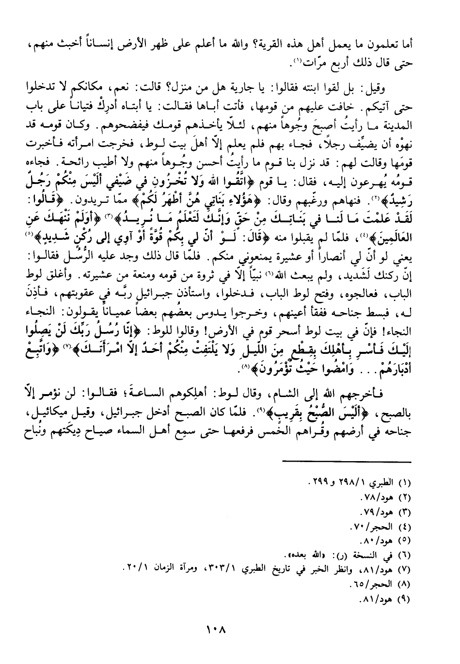 وَقِيلَ: بَلْ لَقُوا ابْنَتَهُ فَقَالُوا: يَا جَارِيَةُ هَلْ مِنْ مَنْزِلٍ؟ قَالَتْ: نَعَمْ، مَكَانَكُمْ لَا تَدْخُلُوا حَتَّى آتِيَكُمْ. خَافَتْ عَلَيْهِمْ مِنْ قَوْمِهَا، فَأَتَتْ أَبَاهَا فَقَالَتْ: يَا أَبَتَاهُ أَدْرِكْ فِتْيَانًا عَلَى بَابِ الْمَدِينَةِ مَا رَأَيْتُ أَصْبَحَ وُجُوهًا مِنْهُمْ لِئَلَّا يَأْخُذَهُمْ قَوْمُكَ فَيَفْضَحُوهُمْ. وَكَانَ قَوْمُهُ قَدْ نَهَوْهُ أَنْ يُضَيِّفَ رَجُلًا، فَجَاءَ بِهِمْ فَلَمْ يَعْلَمْ إِلَّا أَهْلُ بَيْتِ لُوطٍ، فَخَرَجَتِ امْرَأَتُهُ فَأَخْبَرَتْ قَوْمَهَا، وَقَالَتْ لَهُمْ: قَدْ نَزَلَ بِنَا قَوْمٌ مَا رَأَيْتُ أَحْسَنَ وُجُوهًا مِنْهُمْ، وَلَا أَطْيَبَ رَائِحَةً. فَجَاءَهُ قَوْمُهُ يُهْرَعُونَ إِلَيْهِ. فَقَالَ: يَا قَوْمِ {اتَّقُوا اللَّهَ وَلَا تُخْزُونِي فِي ضَيْفِي أَلَيْسَ مِنْكُمْ رَجُلٌ رَشِيدٌ} [هود: 78] . فَنَهَاهُمْ وَرَغَّبَهُمْ وَقَالَ: {هَؤُلَاءِ بَنَاتِي هُنَّ أَطْهَرُ لَكُمْ} [هود: 78] مِمَّا تُرِيدُونَ. {قَالُوا لَقَدْ عَلِمْتَ مَا لَنَا فِي بَنَاتِكَ مِنْ حَقٍّ وَإِنَّكَ لَتَعْلَمُ مَا نُرِيدُ - أَوَلَمْ نَنْهَكَ عَنِ الْعَالَمِينَ} [الحجر: 79 - 70] ، فَلَمَّا لَمْ يَقْبَلُوا مِنْهُ {قَالَ لَوْ أَنَّ لِي بِكُمْ قُوَّةً أَوْ آوِي إِلَى رُكْنٍ شَدِيدٍ} [هود: 80] يَعْنِي لَوْ أَنَّ لِي أَنْصَارًا أَوْ عَشِيرَةً يَمْنَعُونِي مِنْكُمْ. فَلَمَّا قَالَ ذَلِكَ وَجَدَ عَلَيْهِ الرُّسُلُ، فَقَالُوا: إِنَّ رُكْنَكَ لَشَدِيدٌ وَلَمْ يَبْعَثِ اللَّهُ نَبِيًّا إِلَّا فِي ثَرْوَةٍ مِنْ قَوْمِهِ وَمَنَعَةٍ مِنْ عَشِيرَتِهِ. وَأَغْلَقَ لُوطٌ الْبَابَ، فَعَالَجُوهُ، وَفَتَحَ لُوطٌ الْبَابَ، فَدَخَلُوا، وَاسْتَأْذَنَ جَبْرَائِيلُ رَبَّهُ فِي عُقُوبَتِهِمْ فَأَذِنَ لَهُ فَبَسَطَ جَنَاحَيْهِ فَفَقَأَ أَعْيُنَهُمْ وَخَرَجُوا يَدُوسُ بَعْضُهُمْ بَعْضًا عُمْيَانًا يَقُولُونَ: النَّجَاءَ النَّجَاءَ! فَإِنَّ فِي بَيْتِ لُوطٍ أَسْحَرَ قَوْمٍ فِي الْأَرْضِ! وَقَالُوا لِلُوطٍ: {إِنَّا رُسُلُ رَبِّكَ لَنْ يَصِلُوا إِلَيْكَ فَأَسْرِ بِأَهْلِكَ بِقِطْعٍ مِنَ اللَّيْلِ وَلَا يَلْتَفِتْ مِنْكُمْ أَحَدٌ إِلَّا امْرَأَتَكَ - وَاتَّبِعْ أَدْبَارَهُمْ - وَامْضُوا حَيْثُ تُؤْمَرُونَ} [الحجر: 81 - 65] .