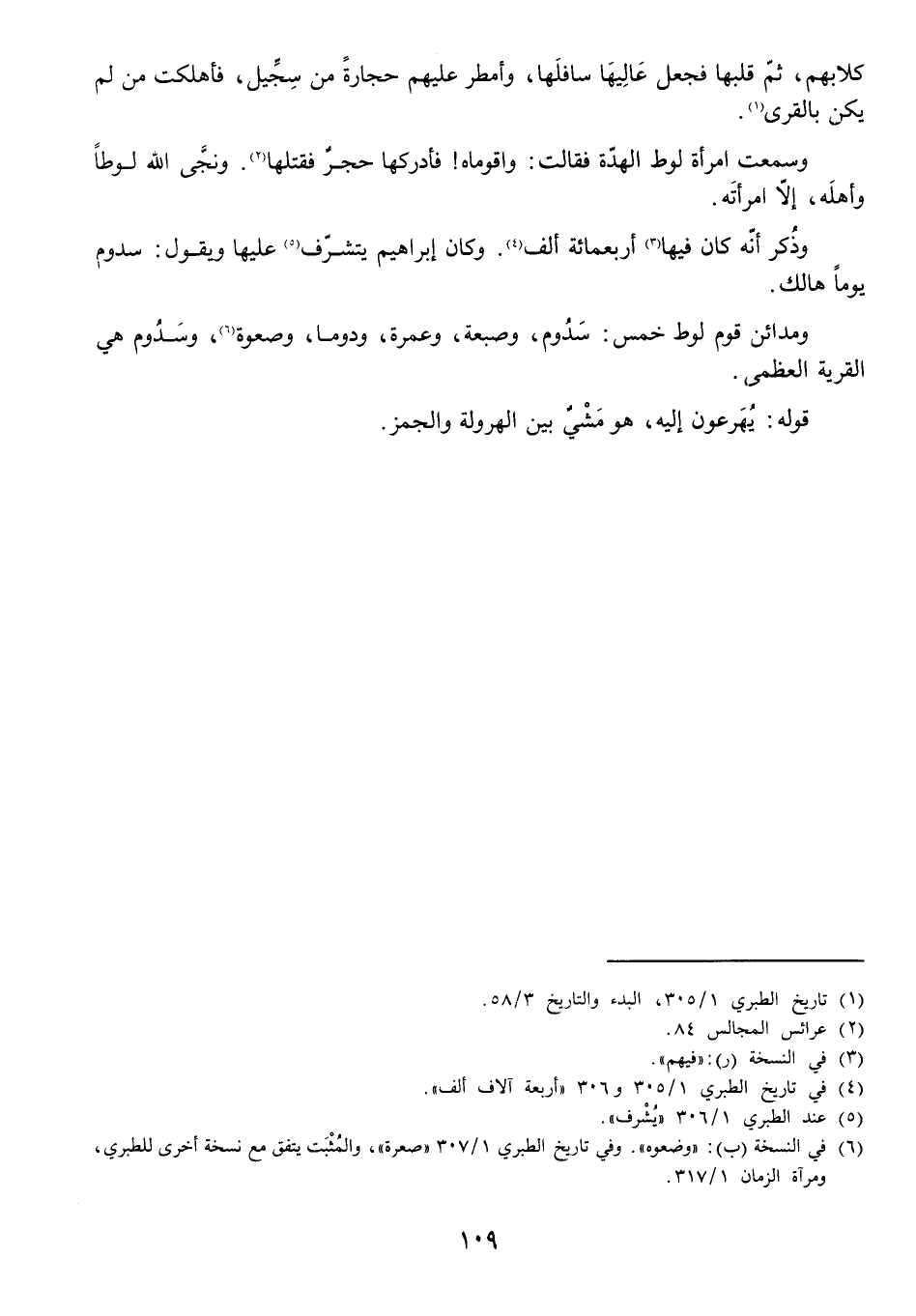وَمَدَائِنُ قَوْمِ لُوطٍ خَمْسٌ: سَدُومُ، وَصَبْعَةُ، وَعَمْرَةُ، وَدَوْمَا، وَصَعْوَةُ، وَسَدُومُ هِيَ الْقَرْيَةُ الْعُظْمَى.