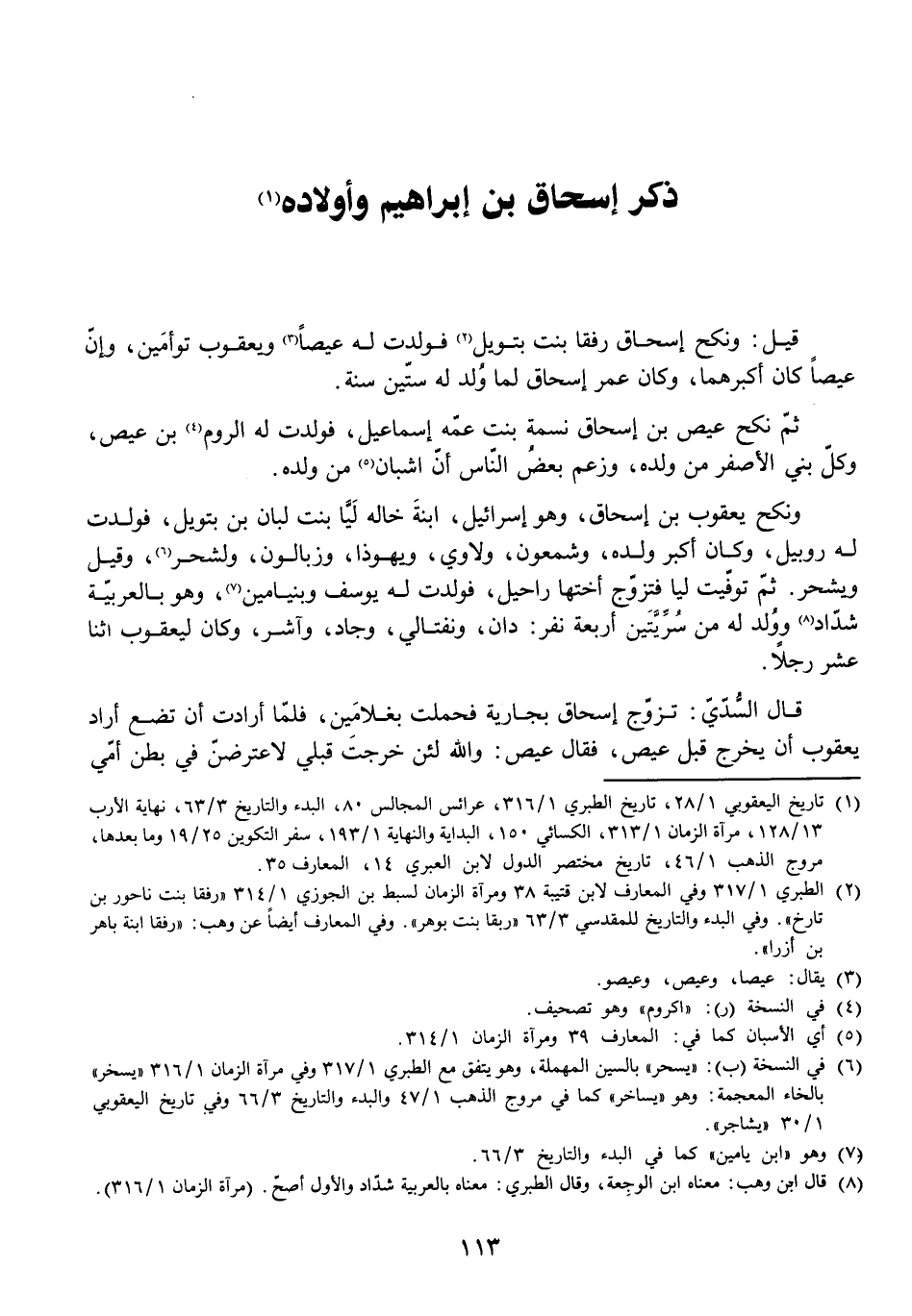 وَنَكَحَ يَعْقُوبُ بْنُ إِسْحَاقَ، وَهُوَ إِسْرَائِيلُ، ابْنَةَ خَالِهِ لَيَّا بِنْتَ لَبَانَ بْنِ بِتْوِيلَ فَوَلَدَتْ لَهُ رُوبِيلَ، وَكَانَ أَكْبَرَ وَلَدِهِ، وَشَمْعُونَ، وَلَاوِيَ وَيَهُوذَا، وَزِبَالُونَ، وَلَشْحَرَ، وَقِيلَ وَيَشْحَرَ، ثُمَّ تُوُفِّيَتْ لَيَّا فَتَزَوَّجَ أُخْتَهَا رَاحِيلَ فَوَلَدَتْ لَهُ يُوسُفَ وَبِنْيَامِينَ، وَهُوَ بِالْعَرَبِيَّةِ شَدَّادٌ، وَوُلِدَ لَهُ مِنْ سُرِّيَّتَيْنِ أَرْبَعَةُ نَفَرٍ: دَانُ، وَنَفْتَالِي، وَجَادُ، وَآشَرُ، وَكَانَ لِيَعْقُوبَ اثْنَا عَشَرَ رَجُلًا.