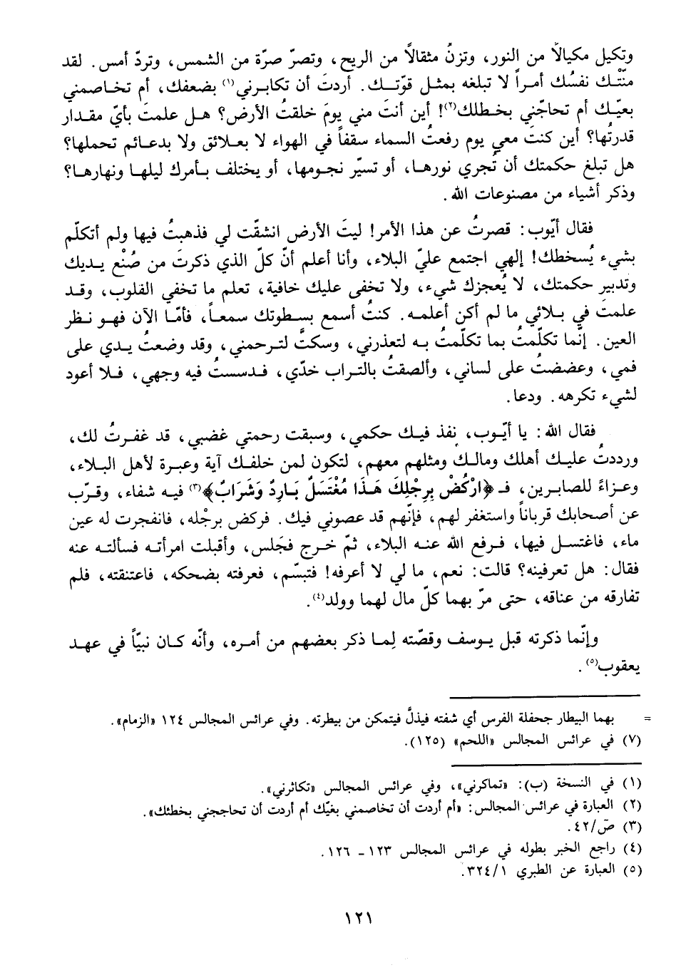 وَتَكِيلُ مِكْيَالًا مِنَ النُّورِ، وَتَزِنُ مِثْقَالًا مِنَ الرِّيحِ، وَتُصِرُّ صُرَّةً مِنَ الشَّمْسِ، وَتَرُدُّ أَمْسِ. لَقَدْ مَنَّتْكَ نَفْسُكَ أَمْرًا لَا تَبْلُغُهُ بِمِثْلِ قُوَّتِكَ. أَرَدْتَ أَنْ تُكَابِرَنِي بِضَعْفِكَ أَمْ تُخَاصِمَنِي بِعَيِّكَ أَمْ تُحَاجِّنِي بِخَطَلِكَ! أَيْنَ أَنْتَ مِنِّي يَوْمَ خَلَقْتُ الْأَرْضَ؟ هَلْ عَلِمْتَ بِأَيِّ مِقْدَارٍ قَدَّرْتُهَا؟ أَيْنَ كُنْتَ مَعِي يَوْمَ رَفَعْتُ السَّمَاءَ سَقْفًا فِي الْهَوَاءِ لَا بِعَلَائِقَ وَلَا بِدَعَائِمَ تَحْمِلُهَا؟ هَلْ تَبْلُغُ حِكْمَتُكَ أَنْ تُجْرِيَ نُورَهَا، أَوْ تُسَيِّرَ نُجُومَهَا، أَوْ يَخْتَلِفَ بِأَمْرِكَ لَيْلُهَا وَنَهَارُهَا؟ وَذَكَرَ أَشْيَاءَ مِنْ مَصْنُوعَاتِ اللَّهِ.