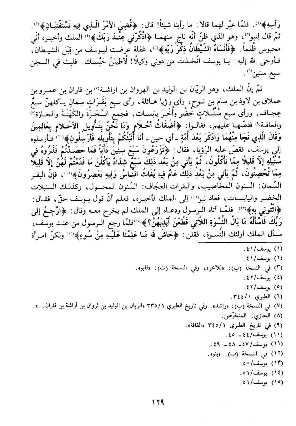 ثُمَّ إِنَّ الْمَلِكَ، وَهُوَ الرَّيَّانُ بْنُ الْوَلِيدِ بْنِ الْهَرَوَانِ بْنِ أَرَاشَةَ بْنِ فَارَانَ بْنِ عَمْرِو بْنِ عِمْلَاقِ بْنِ لَاوُذَ بْنِ سَامِ بْنِ نُوحٍ، رَأَى رُؤْيَا هَائِلَةً، رَأَى سَبْعَ بَقَرَاتٍ سِمَانٍ يَأْكُلُهُنَّ سَبْعٌ عِجَافٌ، وَرَأَى سَبْعَ سُنْبُلَاتٍ خُضْرٍ وَأُخَرَ يَابِسَاتٍ، فَجَمَعَ السَّحَرَةَ وَالْكَهَنَةَ وَالْحَازَةَ وَالْعَافَةَ فَقَصَّهَا عَلَيْهِمْ، فَقَالُوا: {أَضْغَاثُ أَحْلَامٍ وَمَا نَحْنُ بِتَأْوِيلِ الْأَحْلَامِ بِعَالِمِينَ - وَقَالَ الَّذِي نَجَا مِنْهُمَا وَادَّكَرَ بَعْدَ أُمَّةٍ} [يوسف: 44 - 45]- أَيْ حِينٍ - {أَنَا أُنَبِّئُكُمْ بِتَأْوِيلِهِ فَأَرْسِلُونِي} [يوسف: 45] . فَأَرْسَلُوهُ إِلَى يُوسُفَ، فَقَصَّ عَلَيْهِ الرُّؤْيَا، فَقَالَ: {تَزْرَعُونَ سَبْعَ سِنِينَ دَأَبًا فَمَا حَصَدْتُمْ فَذَرُوهُ فِي سُنْبُلِهِ إِلَّا قَلِيلًا مِمَّا تَأْكُلُونَ - ثُمَّ يَأْتِي مِنْ بَعْدِ ذَلِكَ سَبْعٌ شِدَادٌ يَأْكُلْنَ مَا قَدَّمْتُمْ لَهُنَّ إِلَّا قَلِيلًا مِمَّا تُحْصِنُونَ - ثُمَّ يَأْتِي مِنْ بَعْدِ ذَلِكَ عَامٌ فِيهِ يُغَاثُ النَّاسُ وَفِيهِ يَعْصِرُونَ} [يوسف: 47 - 49] ، فَإِنَّ الْبَقَرَ السِّمَانَ: السِّنُونَ الْمَخَاصِيبُ، وَالْبَقَرَاتُ الْعِجَافُ: السِّنُونَ الْمُحُولُ، وَكَذَلِكَ السُّنْبُلَاتُ الْخُضْرُ وَالْيَابِسَاتُ، فَعَادَ نَبْوُ إِلَى الْمَلِكِ فَأَخْبَرَهُ، فَعَلِمَ أَنَّ قَوْلَ يُوسُفَ حَقٌّ، فَقَالَ: {ائْتُونِي بِهِ} [يوسف: 50] . فَلَمَّا أَتَاهُ الرَّسُولُ وَدَعَاهُ إِلَى الْمَلِكِ لَمْ يَخْرُجْ مَعَهُ وَقَالَ: {ارْجِعْ إِلَى رَبِّكَ فَاسْأَلْهُ مَا بَالُ النِّسْوَةِ اللَّاتِي قَطَّعْنَ أَيْدِيَهُنَّ} [يوسف: 50] فَلَمَّا رَجَعَ الرَّسُولُ مِنْ عِنْدِ يُوسُفَ سَأَلَ الْمَلِكُ أُولَئِكَ النِّسْوَةَ فَقُلْنَ: {حَاشَ لِلَّهِ مَا عَلِمْنَا عَلَيْهِ مِنْ سُوءٍ} [يوسف: 51] وَلَكِنَّ امْرَأَةَ