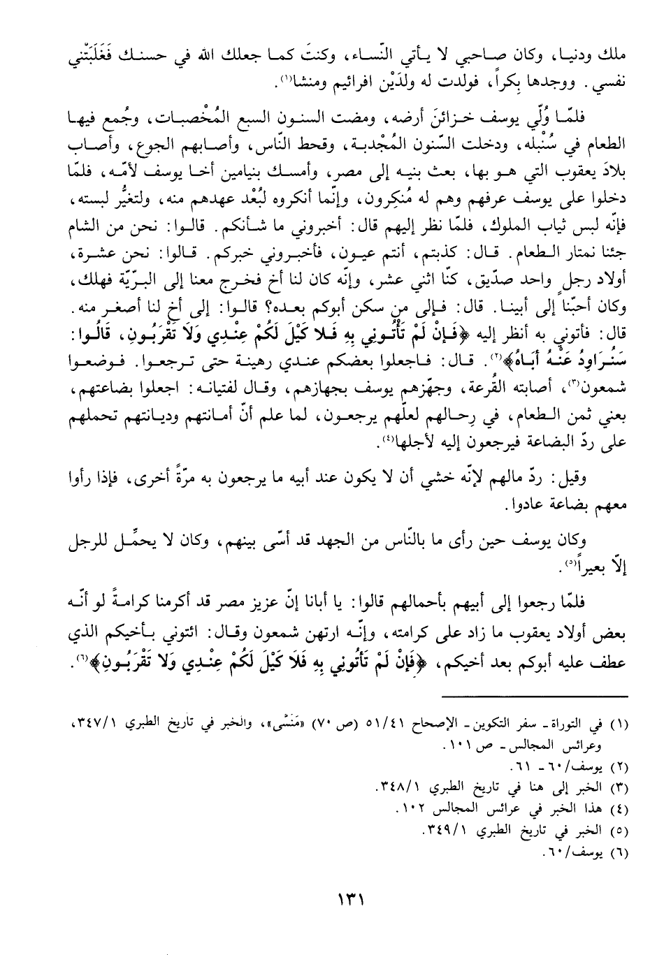 فَلَمَّا وَلِيَ يُوسُفُ خَزَائِنَ أَرْضِهِ وَمَضَتِ السِّنُونَ السَّبْعُ الْمُخْصِبَاتُ وَجَمَعَ فِيهَا الطَّعَامَ فِي سُنْبُلِهِ وَدَخَلَتِ السِّنُونَ الْمُجْدِبَةُ وَقَحَطَ النَّاسُ، وَأَصَابَهُمُ الْجُوعُ، وَأَصَابَ بِلَادَ يَعْقُوبَ الَّتِي هُوَ بِهَا بَعَثَ بَنِيهِ إِلَى مِصْرَ وَأَمْسَكَ بِنْيَامِينَ أَخَا يُوسُفَ لِأُمِّهِ، فَلَمَّا دَخَلُوا عَلَى يُوسُفَ عَرَفَهُمْ وَهُمْ لَهُ مُنْكِرُونَ، وَإِنَّمَا أَنْكَرُوهُ لِبُعْدِ عَهْدِهِمْ مِنْهُ وَلِتَغَيُّرِ لُبْسَتِهِ، فَإِنَّهُ لَبِسَ ثِيَابَ الْمُلُوكِ، فَلَمَّا نَظَرَ إِلَيْهِمْ قَالَ: أَخْبِرُونِي مَا شَأْنُكُمْ. قَالُوا: نَحْنُ مِنَ الشَّامِ جِئْنَا نَمْتَارُ الطَّعَامَ. قَالَ: كَذَبْتُمْ، أَنْتُمْ عُيُونٌ، فَأَخْبِرُونِي خَبَرَكُمْ. قَالُوا: نَحْنُ عَشَرَةُ أَوْلَادِ رَجُلٍ وَاحِدٍ صِدِّيقٍ، كُنَّا اثْنَيْ عَشَرَ، وَإِنَّهُ كَانَ لَنَا أَخٌ فَخَرَجَ مَعَنَا فِي الْبَرِّيَّةِ فَهَلَكَ، وَكَانَ أَحَبَّنَا إِلَى أَبِينَا. قَالَ: فَإِلَى مَنْ سَكَنَ أَبُوكُمْ بَعْدَهُ؟ قَالُوا: إِلَى أَخٍ لَنَا أَصْغَرَ مِنْهُ. قَالَ: فَأْتُونِي بِهِ أَنْظُرْ إِلَيْهِ {فَإِنْ لَمْ تَأْتُونِي بِهِ فَلَا كَيْلَ لَكُمْ عِنْدِي وَلَا تَقْرَبُونِ - قَالُوا سَنُرَاوِدُ عَنْهُ أَبَاهُ} [يوسف: 60 - 61] . قَالَ: فَاجْعَلُوا بَعْضَكُمْ عِنْدِي رَهِينَةً حَتَّى تَرْجِعُوا. فَوَضَعُوا شَمْعُونَ، أَصَابَتْهُ الْقُرْعَةُ، وَجَهَّزَهُمْ يُوسُفُ بِجَهَازِهِمْ، وَقَالَ لِفِتْيَانِهِ: اجْعَلُوا بِضَاعَتَهُمْ، يَعْنِي ثَمَنَ الطَّعَامِ، فِي رِحَالِهِمْ لَعَلَّهُمْ يَرْجِعُونَ، لَمَّا عَلِمَ أَنَّ أَمَانَتَهُمْ وَدِيَانَتَهُمْ تَحْمِلُهُمْ عَلَى رَدِّ الْبِضَاعَةِ فَيَرْجِعُونَ إِلَيْهِ لِأَجْلِهَا.