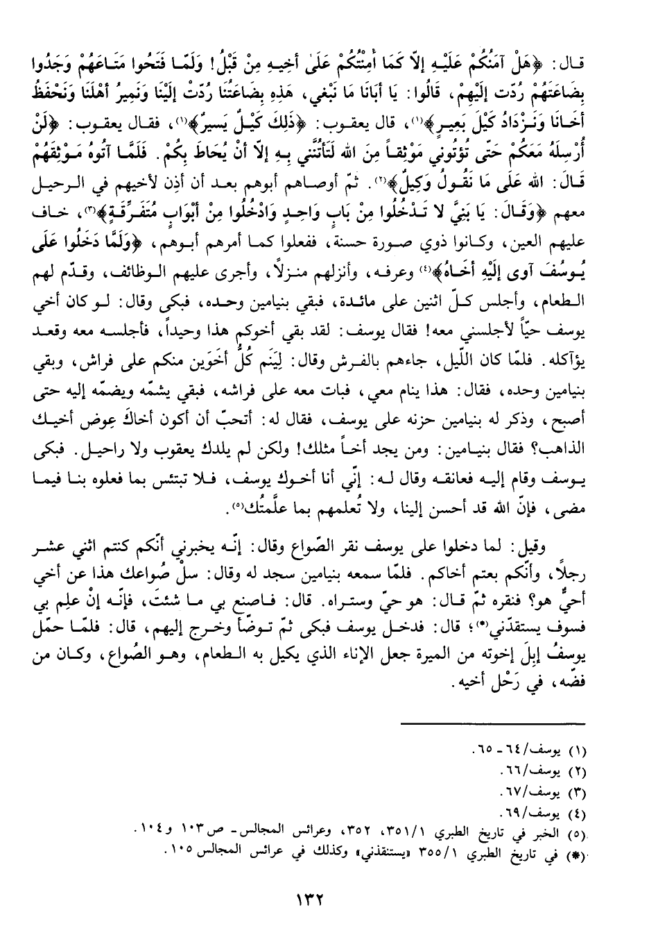 قَالَ: {هَلْ آمَنُكُمْ عَلَيْهِ إِلَّا كَمَا أَمِنْتُكُمْ عَلَى أَخِيهِ مِنْ قَبْلُ - وَلَمَّا فَتَحُوا مَتَاعَهُمْ وَجَدُوا بِضَاعَتَهُمْ رُدَّتْ إِلَيْهِمْ - قَالُوا يَاأَبَانَا مَا نَبْغِي هَذِهِ بِضَاعَتُنَا رُدَّتْ إِلَيْنَا وَنَمِيرُ أَهْلَنَا وَنَحْفَظُ أَخَانَا وَنَزْدَادُ كَيْلَ بَعِيرٍ} [يوسف: 64 - 65] ، قَالَ يَعْقُوبُ: {ذَلِكَ كَيْلٌ يَسِيرٌ} [يوسف: 65] ، فَقَالَ يَعْقُوبُ: {لَنْ أُرْسِلَهُ مَعَكُمْ حَتَّى تُؤْتُونِ مَوْثِقًا مِنَ اللَّهِ لَتَأْتُنَّنِي بِهِ إِلَّا أَنْ يُحَاطَ بِكُمْ فَلَمَّا آتَوْهُ مَوْثِقَهُمْ قَالَ اللَّهُ عَلَى مَا نَقُولُ وَكِيلٌ} [يوسف: 66] . ثُمَّ أَوْصَاهُمْ أَبُوهُمْ بَعْدَ أَنْ أَذِنَ لِأَخِيهِمْ فِي الرَّحِيلِ مَعَهُمْ {وَقَالَ يَابَنِيَّ لَا تَدْخُلُوا مِنْ بَابٍ وَاحِدٍ وَادْخُلُوا مِنْ أَبْوَابٍ مُتَفَرِّقَةٍ} [يوسف: 67] ، خَافَ عَلَيْهِمُ الْعَيْنَ، وَكَانُوا ذَوِي صُورَةٍ حَسَنَةٍ، فَفَعَلُوا كَمَا أَمَرَهُمْ أَبُوهُمْ، {وَلَمَّا دَخَلُوا عَلَى يُوسُفَ آوَى إِلَيْهِ أَخَاهُ} [يوسف: 69] وَعَرَفَهُ وَأَنْزَلَهُمْ مَنْزِلًا وَأَجْرَى عَلَيْهِمُ الْوَظَائِفَ وَقَدَّمَ لَهُمُ الطَّعَامَ وَأَجْلَسَ كُلَّ اثْنَيْنِ عَلَى مَائِدَةٍ، فَبَقِيَ بِنْيَامِينُ وَحْدَهُ، فَبَكَى وَقَالَ: لَوْ كَانَ أَخِي يُوسُفُ حَيًّا لَأَجْلَسَنِي مَعَهُ! فَقَالَ يُوسُفُ: لَقَدْ بَقِيَ أَخُوكُمْ هَذَا وَحِيدًا، فَأَجْلَسَهُ مَعَهُ وَقَعَدَ يُؤَاكِلُهُ. فَلَمَّا كَانَ اللَّيْلُ جَاءَهُمْ بِالْفِرَاشِ وَقَالَ: لِيَنَمْ كُلُّ أَخَوَيْنِ مِنْكُمْ عَلَى فِرَاشٍ، وَبَقِيَ بِنْيَامِينُ وَحْدَهُ، فَقَالَ: هَذَا يَنَامُ مَعِي، فَبَاتَ مَعَهُ عَلَى فِرَاشِهِ، فَبَقِيَ يَشُمُّهُ وَيَضُمُّهُ إِلَيْهِ حَتَّى أَصْبَحَ، وَذَكَرَ لَهُ بِنْيَامِينُ حُزْنَهُ عَلَى يُوسُفَ، فَقَالَ لَهُ: أَتُحِبُّ أَنْ أَكُونَ أَخَاكَ عِوَضَ أَخِيكَ الذَّاهِبِ؟ فَقَالَ بِنْيَامِينُ: وَمَنْ يَجِدُ أَخًا مِثْلَكَ! وَلَكِنْ لَمْ يَلِدْكَ يَعْقُوبُ وَلَا رَاحِيلُ. فَبَكَى يُوسُفُ وَقَامَ إِلَيْهِ فَعَانَقَهُ، وَقَالَ لَهُ: إِنِّي أَنَا أَخُوكَ يُوسُفُ فَلَا تَبْتَئِسْ بِمَا فَعَلُوهُ بِنَا فِيمَا مَضَى، فَإِنَّ اللَّهَ قَدْ أَحْسَنَ إِلَيْنَا، وَلَا تُعْلِمْهُمْ بِمَا عَلَّمْتُكَ.