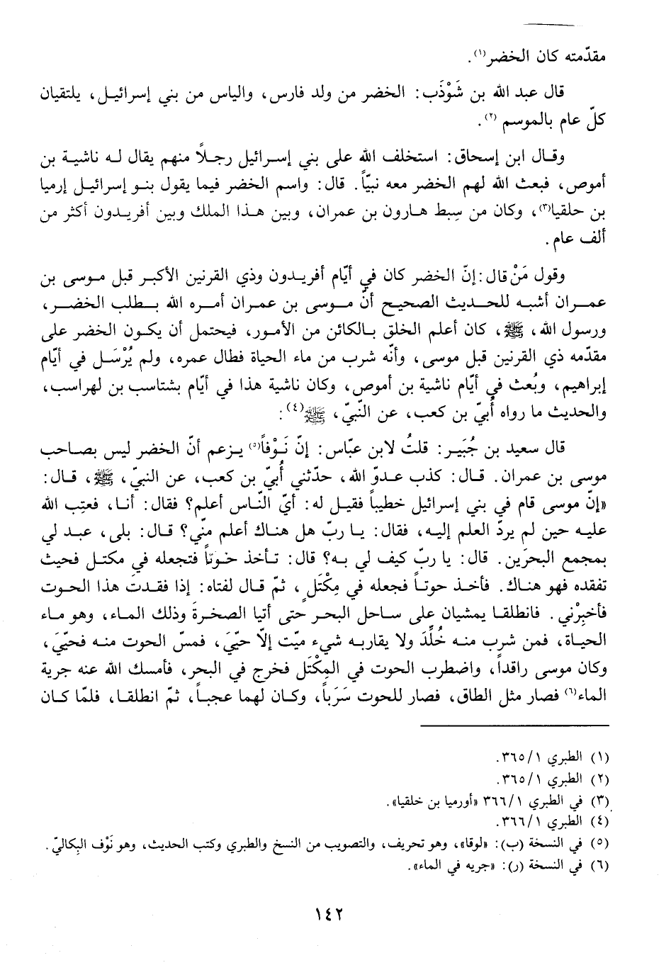 وَقَوْلُ مَنْ قَالَ إِنَّ الْخَضِرَ كَانَ فِي أَيَّامِ أَفْرِيدُونَ وَذِي الْقَرْنَيْنِ الْأَكْبَرِ قَبْلَ مُوسَى بْنِ عِمْرَانَ أَشْبَهُ لِلْحَدِيثِ الصَّحِيحِ أَنَّ مُوسَى بْنَ عِمْرَانَ أَمَرَهُ اللَّهُ بِطَلَبِ الْخَضِرِ، وَرَسُولُ اللَّهِ - صَلَّى اللَّهُ عَلَيْهِ وَسَلَّمَ - كَانَ أَعْلَمَ الْخَلْقِ بِالْكَائِنِ مِنَ الْأُمُورِ، فَيُحْتَمَلُ أَنْ يَكُونَ الْخَضِرُ عَلَى مَقْدَمَةِ ذِي الْقَرْنَيْنِ قَبْلَ مُوسَى، وَأَنَّهُ شَرِبَ مِنْ مَاءِ الْحَيَاةِ فَطَالَ عُمُرُهُ، وَلَمْ يُرْسَلْ فِي أَيَّامِ إِبْرَاهِيمَ، وَبُعِثَ فِي أَيَّامِ نَاشِيَةَ بْنِ أَمُوصَ، وَكَانَ نَاشِيَةُ هَذَا فِي أَيَّامِ بَشْتَاسِبَ بْنِ لَهُرَاسِبَ، وَالْحَدِيثُ مَا رَوَاهُ أُبَيُّ بْنُ كَعْبٍ، عَنِ النَّبِيِّ - صَلَّى اللَّهُ عَلَيْهِ وَسَلَّمَ -، قَالَ سَعِيدُ بْنُ جُبَيْرٍ: قُلْتُ لِـ ابْنِ عَبَّاسٍ: إِنَّ نَوْفًا يَزْعُمُ أَنَّ الْخَضِرَ لَيْسَ بِصَاحِبِ مُوسَى بْنِ عِمْرَانَ. قَالَ: كَذَبَ عَدُوُّ اللَّهِ، حَدَّثَنِي أُبَيُّ بْنُ كَعْبٍ، عَنِ النَّبِيِّ - صَلَّى اللَّهُ عَلَيْهِ وَسَلَّمَ - قَالَ: «إِنَّ مُوسَى قَامَ فِي بَنِي إِسْرَائِيلَ خَطِيبًا، فَقِيلَ لَهُ: أَيُّ النَّاسِ أَعْلَمُ؟ فَقَالَ: أَنَا، فَعَتَبَ اللَّهُ عَلَيْهِ حِينَ لَمْ يَرُدَّ الْعِلْمَ إِلَيْهِ، فَقَالَ: يَا رَبِّ، هَلْ هُنَاكَ أَعْلَمُ مِنِّي؟ قَالَ: بَلَى، عَبْدٌ لِي بِمَجْمَعِ الْبَحْرَيْنِ. قَالَ: يَا رَبِّ كَيْفَ لِي بِهِ؟ قَالَ: تَأْخُذُ حُوتًا فَتَجْعَلُهُ فِي مِكْتَلٍ فَحَيْثُ تَفْقِدُهُ فَهُوَ هُنَاكَ. فَأَخَذَ حُوتًا فَجَعَلَهُ فِي مِكْتَلٍ، ثُمَّ قَالَ لِفَتَاهُ: إِذَا فَقَدْتَ هَذَا الْحُوتَ فَأَخْبِرْنِي. فَانْطَلَقَا يَمْشِيَانِ عَلَى سَاحِلِ الْبَحْرِ حَتَّى أَتَيَا الصَّخْرَةَ، وَذَلِكَ الْمَاءَ، وَهُوَ مَاءُ الْحَيَاةِ، فَمَنْ شَرِبَ مِنْهُ خُلِّدَ وَلَا يُقَارِبُهُ شَيْءٌ مَيِّتٌ إِلَّا حَيِيَ، فَمَسَّ الْحُوتُ مِنْهُ فَحَيِيَ، وَكَانَ مُوسَى رَاقِدًا، وَاضْطَرَبَ الْحُوتُ فِي الْمِكْتَلِ، فَخَرَجَ فِي الْبَحْرِ، فَأَمْسَكَ اللَّهُ عَنْهُ جَرْيَةَ الْمَاءِ فَصَارَ مِثْلَ الطَّاقِ، فَصَارَ لِلْحُوتِ سَرَبٌ، وَكَانَ لَهُمَا عَجَبًا، ثُمَّ انْطَلَقَا، فَلَمَّا كَانَ