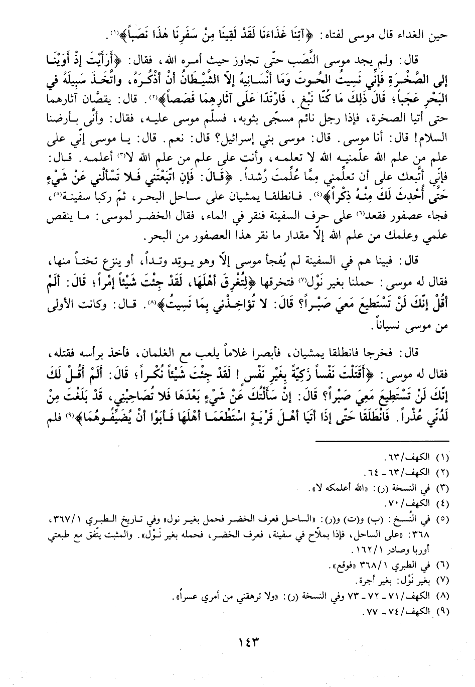 قَالَ: وَلَمْ يَجِدْ مُوسَى النَّصْبَ حَتَّى تَجَاوَزَ حَيْثُ أَمَرَهُ اللَّهُ، فَقَالَ: {أَرَأَيْتَ إِذْ أَوَيْنَا إِلَى الصَّخْرَةِ فَإِنِّي نَسِيتُ الْحُوتَ وَمَا أَنْسَانِيهُ إِلَّا الشَّيْطَانُ أَنْ أَذْكُرَهُ وَاتَّخَذَ سَبِيلَهُ فِي الْبَحْرِ عَجَبًا - قَالَ ذَلِكَ مَا كُنَّا نَبْغِ فَارْتَدَّا عَلَى آثَارِهِمَا قَصَصًا} [الكهف: 63 - 64] . قَالَ: يَقُصَّانِ آثَارَهُمَا حَتَّى أَتَيَا الصَّخْرَةَ، فَإِذَا رَجُلٌ نَائِمٌ مُسَجًّى بِثَوْبِهِ، فَسَلَّمَ مُوسَى عَلَيْهِ. فَقَالَ: وَأَنَّى بِأَرْضِنَا السَّلَامُ! قَالَ: أَنَا مُوسَى. قَالَ: مُوسَى بَنِي إِسْرَائِيلَ؟ قَالَ: نَعَمْ. قَالَ: يَا مُوسَى إِنِّي عَلَى عِلْمٍ مِنْ عِلْمِ اللَّهِ عَلَّمَنِيهِ اللَّهُ لَا تَعْلَمُهُ، وَأَنْتَ عَلَى عِلْمٍ مِنْ عِلْمِ اللَّهِ لَا أَعْلَمُهُ. قَالَ: فَإِنِّي أَتَّبِعُكَ عَلَى أَنْ تُعَلِّمَنِي مِمَّا عُلِّمْتَ رُشْدًا. {قَالَ فَإِنِ اتَّبَعْتَنِي فَلَا تَسْأَلْنِي عَنْ شَيْءٍ حَتَّى أُحْدِثَ لَكَ مِنْهُ ذِكْرًا} [الكهف: 70] . فَانْطَلَقَا يَمْشِيَانِ عَلَى سَاحِلِ الْبَحْرِ ثُمَّ رَكِبَا سَفِينَةً، فَجَاءَ عُصْفُورٌ فَقَعَدَ عَلَى حَرْفِ السَّفِينَةِ فَنَقَرَ فِي الْمَاءِ، فَقَالَ الْخَضِرُ لِمُوسَى مَا يَنْقُصُ عِلْمِي وَعِلْمُكَ مِنْ عِلْمِ اللَّهِ إِلَّا مِقْدَارَ مَا نَقَرَ هَذَا الْعُصْفُورُ مِنَ الْبَحْرِ.