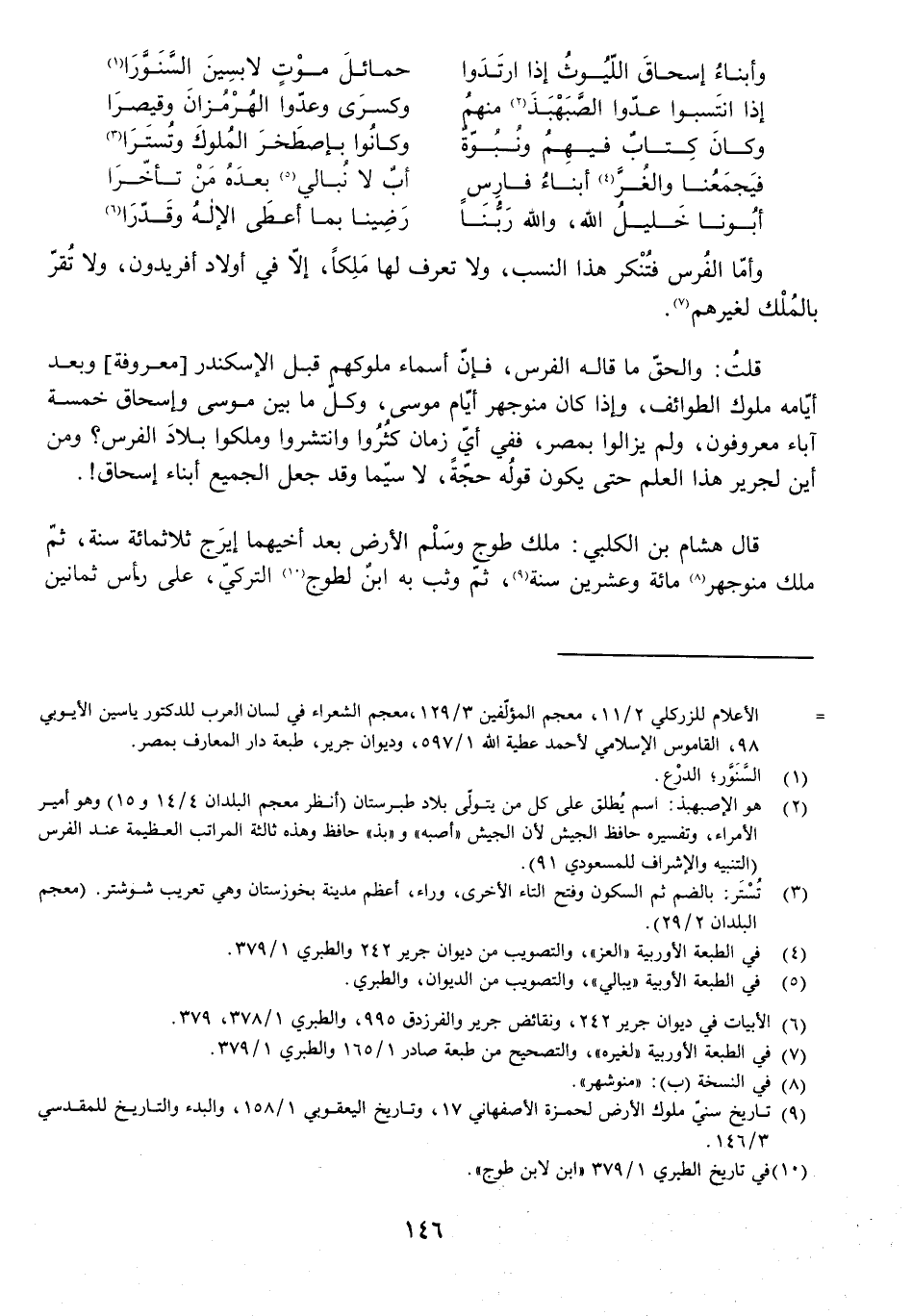 قُلْتُ: وَالْحَقُّ مَا قَالَهُ الْفُرْسُ، فَإِنَّ أَسْمَاءَ مُلُوكِهِمْ قَبْلَ الْإِسْكَنْدَرِ مَعْرُوفَةٌ وَبَعْدَ أَيَّامِهِ مُلُوكُ الطَّوَائِفِ، وَإِذَا كَانَ مِنُوجِهْرُ أَيَّامَ مُوسَى، وَكُلُّ مَا بَيْنَ مُوسَى وَإِسْحَاقَ خَمْسَةُ آبَاءٍ مَعْرُوفُونَ، وَلَمْ يَزَالُوا بِمِصْرَ، فَفِي أَيِّ زَمَانٍ كَثُرُوا وَانْتَشَرُوا، وَمَلَكُوا بِلَادَ الْفُرْسِ؟ وَمِنْ أَيْنَ لِجَرِيرٍ هَذَا الْعِلْمُ حَتَّى يَكُونَ قَوْلُهُ حُجَّةً، وَلَا سِيَّمَا وَقَدْ جَعَلَ الْجَمِيعَ أَبْنَاءَ إِسْحَاقَ!