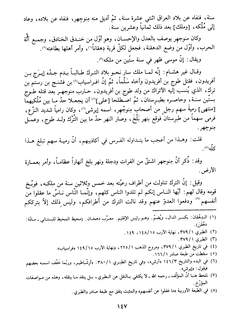 وَقَالَ غَيْرُ هِشَامٍ: إِنَّهُ لَمَّا مَلَكَ سَارَ نَحْوَ بِلَادِ التُّرْكِ طَالِبًا بِدَمِ جَدِّهِ إِيرَجَ بْنِ أَفْرِيدُونَ، فَقَتَلَ طُوجَ بْنَ أَفْرِيدُونَ وَأَخَاهُ سَلْمًا، ثُمَّ إِنَّ أَفْرَاسِيَابَ بْنَ فَشْنَجَ بْنِ رُسْتَمَ بْنِ تُرْكٍ، الَّذِي يُنْسَبُ إِلَيْهِ الْأَتْرَاكُ مِنْ وَلَدِ طُوجَ بْنِ أَفْرِيدُونَ، حَارَبَ مِنُوجِهْرَ بَعْدَ قَتْلِهِ طُوجَ بِسِتِّينَ سَنَةً وَحَاصَرَهُ بِطَبَرِسْتَانَ، ثُمَّ اصْطَلَحَا عَلَى أَنْ يَجْعَلَا حَدَّ مَا بَيْنَ مُلْكَيْهِمَا مُنْتَهَى رَمْيَةِ سَهْمِ رَجُلٍ مِنْ أَصْحَابِ مِنُوجِهْرَ اسْمُهُ إِيرِشَى، وَكَانَ رَامِيًا شَدِيدَ النَّزْعِ، فَرَمَى سَهْمًا مِنْ طَبَرِسْتَانَ فَوَقَعَ بِنَهْرِ بَلْخَ، وَصَارَ النَّهْرُ حَدَّ مَا بَيْنَ التُّرْكِ وَلَدِ طُوجَ وَعَمَلِ مِنُوجِهْرَ.