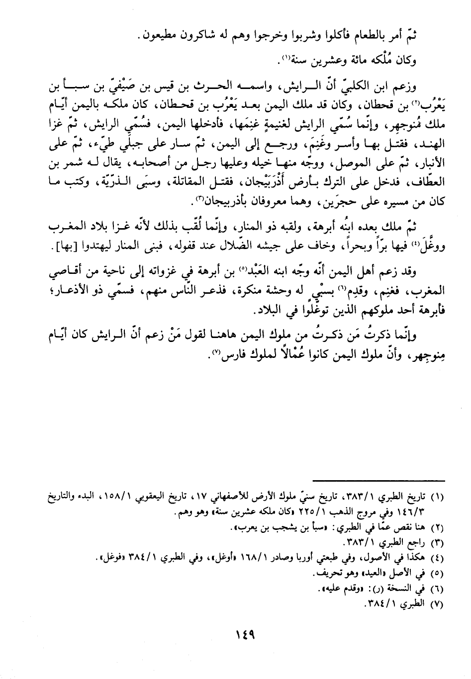 وَإِنَّمَا ذَكَرْتُ مَنْ ذَكَرْتُ مِنْ مُلُوكِ الْيَمَنِ هَهُنَا لِقَوْلِ مَنْ زَعَمَ أَنَّ الرَّايِشَ كَانَ أَيَّامَ مِنُوجِهْرَ وَأَنَّ مُلُوكَ الْيَمَنِ كَانُوا عُمَّالًا لِمُلُوكِ فَارِسَ.