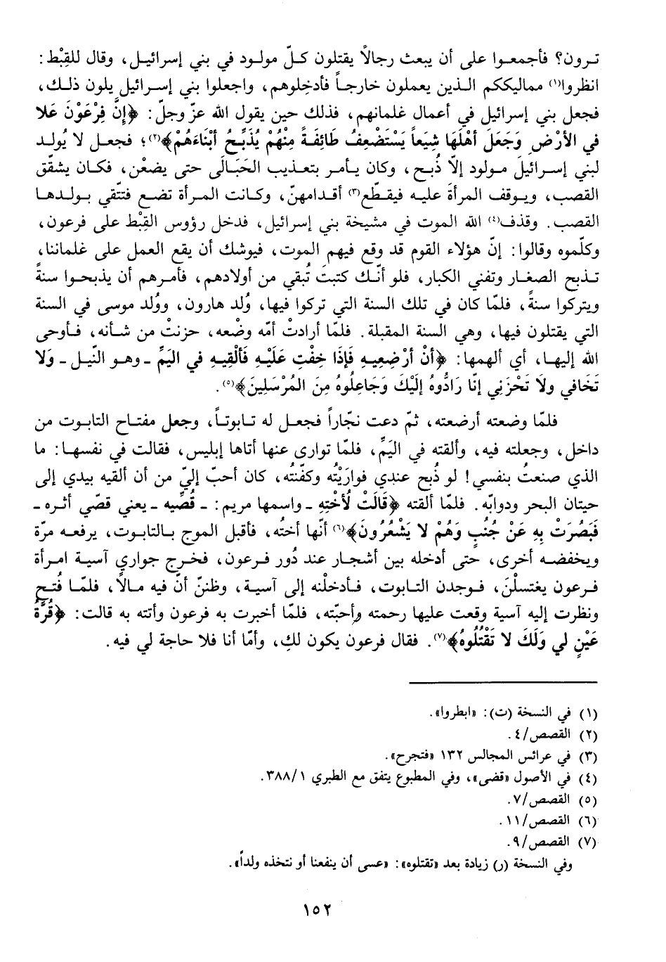 تَرَوْنَ؟ فَأَجْمَعُوا عَلَى أَنْ يَبْعَثَ رِجَالًا يَقْتُلُونَ كُلَّ مَوْلُودٍ فِي بَنِي إِسْرَائِيلَ، وَقَالَ لِلْقِبْطِ: انْظُرُوا مَمَالِيكَكُمُ الَّذِينَ يَعْمَلُونَ خَارِجًا فَأَدْخِلُوهُمْ وَاجْعَلُوا بَنِي إِسْرَائِيلَ يَلُونَ ذَلِكَ، فَجَعَلَ بَنِي إِسْرَائِيلَ فِي أَعْمَالِ غِلْمَانِهِمْ، فَذَلِكَ حِينَ يَقُولُ اللَّهُ - عَزَّ وَجَلَّ -: {إِنَّ فِرْعَوْنَ عَلَا فِي الْأَرْضِ وَجَعَلَ أَهْلَهَا شِيَعًا يَسْتَضْعِفُ طَائِفَةً مِنْهُمْ يُذَبِّحُ أَبْنَاءَهُمْ} [القصص: 4] ، فَجَعَلَ لَا يُولَدُ لِبَنِي إِسْرَائِيلَ مَوْلُودٌ إِلَّا ذُبِحَ وَكَانَ يَأْمُرُ بِتَعْذِيبِ الْحَبَالَى حَتَّى يَضَعْنَ، فَكَانَ يَشُقُّ الْقَصَبَ وَيُوقِفُ الْمَرْأَةَ عَلَيْهِ فَيَقْطَعُ أَقْدَامَهُنَّ، وَكَانَتِ الْمَرْأَةُ تَضَعُ فَتَتَّقِي بِوَلَدِهَا الْقَصَبَ، وَقَذَفَ اللَّهُ الْمَوْتَ فِي مَشْيَخَةِ بَنِي إِسْرَائِيلَ، فَدَخَلَ رُءُوسُ الْقِبْطِ عَلَى فِرْعَوْنَ وَكَلَّمُوهُ، وَقَالُوا: إِنَّ هَؤُلَاءِ الْقَوْمَ قَدْ وَقَعَ فِيهِمُ الْمَوْتُ فَيُوشِكُ أَنْ يَقَعَ الْعَمَلُ عَلَى غِلْمَانِنَا، تَذْبَحُ الصِّغَارَ وَتُفْنِي الْكِبَارَ، فَلَوْ أَنَّكَ كَتَبْتَ تُبْقِي مِنْ أَوْلَادِهِمْ، فَأَمَرَهُمْ أَنْ يَذْبَحُوا سَنَةً وَيَتْرُكُوا سَنَةً، فَلَمَّا كَانَ فِي تِلْكَ السَّنَةِ الَّتِي تَرَكُوا فِيهَا وُلِدَ هَارُونُ، وَوُلِدَ مُوسَى فِي السَّنَةِ الَّتِي يَقْتُلُونَ فِيهَا، وَهِيَ السَّنَةُ الْمُقْبِلَةُ. فَلَمَّا أَرَادَتْ أُمُّهُ وَضْعَهُ حَزِنَتْ مِنْ شَأْنِهِ، فَأَوْحَى اللَّهُ إِلَيْهَا، أَيْ أَلْهَمَهَا: {أَنْ أَرْضِعِيهِ فَإِذَا خِفْتِ عَلَيْهِ فَأَلْقِيهِ فِي الْيَمِّ} [القصص: 7]- وَهُوَ النِّيلُ - {وَلَا تَخَافِي وَلَا تَحْزَنِي إِنَّا رَادُّوهُ إِلَيْكِ وَجَاعِلُوهُ مِنَ الْمُرْسَلِينَ} [القصص: 7] .