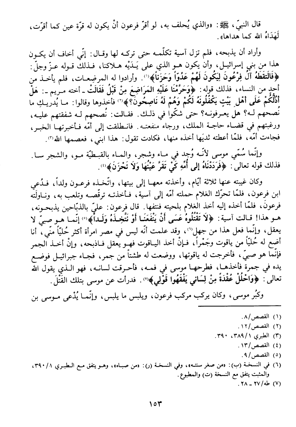 وَأَرَادَ أَنْ يَذْبَحَهُ فَلَمْ تَزَلْ آسِيَةُ تُكَلِّمُهُ حَتَّى تَرَكَهُ لَهَا وَقَالَ: إِنِّي أَخَافُ أَنْ يَكُونَ هَذَا مِنْ بَنِي إِسْرَائِيلَ وَأَنْ يَكُونَ هَذَا الَّذِي عَلَى يَدَيْهِ هَلَاكُنَا، فَذَلِكَ قَوْلُهُ - عَزَّ وَجَلَّ -: {فَالْتَقَطَهُ آلُ فِرْعَوْنَ لِيَكُونَ لَهُمْ عَدُوًّا وَحَزَنًا} [القصص: 8] . وَأَرَادُوا لَهُ الْمُرْضِعَاتِ فَلَمْ يَأْخُذْ مِنْ أَحَدٍ مِنَ النِّسَاءِ، فَذَلِكَ قَوْلُهُ: {وَحَرَّمْنَا عَلَيْهِ الْمَرَاضِعَ مِنْ قَبْلُ فَقَالَتْ} [القصص: 12]- أُخْتُهُ مَرْيَمُ - {هَلْ أَدُلُّكُمْ عَلَى أَهْلِ بَيْتٍ يَكْفُلُونَهُ لَكُمْ وَهُمْ لَهُ نَاصِحُونَ} [القصص: 12] . فَأَخَذُوهَا، وَقَالُوا: مَا يُدْرِيكِ مَا نُصْحُهُمْ لَهُ؟ هَلْ يَعْرِفُونَهُ؟ حَتَّى شَكُّوا فِي ذَلِكَ. فَقَالَتْ: نُصْحُهُمْ لَهُ، وَشَفَقَتُهُمْ عَلَيْهِ، وَرَغْبَتُهُمْ فِي قَضَاءِ حَاجَةِ الْمَلِكِ، وَرَجَاءُ مَنْفَعَتِهِ. فَانْطَلَقَتْ إِلَى أُمِّهِ فَأَخْبَرَتْهَا الْخَبَرَ، فَجَاءَتْ أُمُّهُ، فَلَمَّا أَعْطَتْهُ ثَدْيَهَا أَخَذَهُ مِنْهَا، فَكَادَتْ تَقُولُ: هَذَا ابْنِي، فَعَصَمَهَا اللَّهُ.