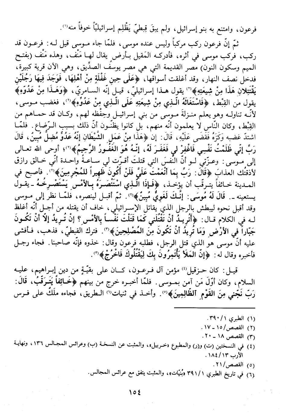 ثُمَّ إِنَّ فِرْعَوْنَ رَكِبَ مَرْكِبًا وَلَيْسَ عِنْدَهُ مُوسَى فَلَمَّا جَاءَ مُوسَى قِيلَ لَهُ: فِرْعَوْنُ قَدْ رَكِبَ، فَرَكِبَ مُوسَى فِي أَثَرِهِ فَأَدْرَكَهُ الْمَقِيلُ بِأَرْضٍ يُقَالُ لَهَا مَنْفُ - وَهَذِهِ مَنْفُ (بِفَتْحِ الْمِيمِ وَسُكُونِ النُّونِ) - مِصْرُ الْقَدِيمَةُ الَّتِي هِيَ مِصْرُ يُوسُفَ الصِّدِّيقِ، وَهِيَ الْآنُ قَرْيَةٌ كَبِيرَةٌ، فَدَخَلَ نِصْفُ النَّهَارِ، وَقَدْ أَغْلَقَتْ أَسْوَاقَهَا، {عَلَى حِينِ غَفْلَةٍ مِنْ أَهْلِهَا فَوَجَدَ فِيهَا رَجُلَيْنِ يَقْتَتِلَانِ هَذَا مِنْ شِيعَتِهِ} [القصص: 15] يَقُولُ هَذَا إِسْرَائِيلِيٌّ قِيلَ إِنَّهُ السَّامِرِيُّ {وَهَذَا مِنْ عَدُوِّهِ} [القصص: 15] يَقُولُ مِنَ الْقِبْطِ {فَاسْتَغَاثَهُ الَّذِي مِنْ شِيعَتِهِ عَلَى الَّذِي مِنْ عَدُوِّهِ} [القصص: 15] ، فَغَضِبَ مُوسَى لِأَنَّهُ تَنَاوَلَهُ وَهُوَ يَعْلَمُ مَنْزِلَةَ مُوسَى مِنْ بَنِي إِسْرَائِيلَ وَحِفْظَهُ لَهُمْ، وَكَانَ قَدْ حَمَاهُمْ مِنَ الْقِبْطِ، وَكَانَ النَّاسُ لَا يَعْلَمُونَ أَنَّهُ مِنْهُمْ بَلْ كَانُوا يَظُنُّونَ أَنَّ ذَلِكَ بِسَبَبِ الرَّضَاعِ. فَلَمَّا اشْتَدَّ غَضَبُهُ وَكَزَهُ فَقَضَى عَلَيْهِ، قَالَ: إِنَّ {هَذَا مِنْ عَمَلِ الشَّيْطَانِ إِنَّهُ عَدُوٌّ مُضِلٌّ مُبِينٌ - قَالَ رَبِّ إِنِّي ظَلَمْتُ نَفْسِي فَاغْفِرْ لِي فَغَفَرَ لَهُ إِنَّهُ هُوَ الْغَفُورُ الرَّحِيمُ} [القصص: 15 - 16] ، أَوْحَى اللَّهُ تَعَالَى إِلَى مُوسَى: وَعِزَّتِي لَوْ أَنَّ النَّفْسَ الَّتِي قَتَلْتَ أَقَرَّتْ لِي سَاعَةً وَاحِدَةً أَنِّي خَالِقٌ رَازِقٌ لَأَذَقْتُكَ الْعَذَابَ. {قَالَ رَبِّ بِمَا أَنْعَمْتَ عَلَيَّ فَلَنْ أَكُونَ ظَهِيرًا لِلْمُجْرِمِينَ} [القصص: 17] . فَأَصْبَحَ فِي الْمَدِينَةِ خَائِفًا يَتَرَقَّبُ أَنْ يُؤْخَذَ، {فَإِذَا الَّذِي اسْتَنْصَرَهُ بِالْأَمْسِ يَسْتَصْرِخُهُ} [القصص: 18]- يَقُولُ يَسْتَعِينُهُ - {قَالَ لَهُ مُوسَى إِنَّكَ لَغَوِيٌّ مُبِينٌ} [القصص: 18] . ثُمَّ أَقْبَلَ لِيَنْصُرَهُ، فَلَمَّا نَظَرَ إِلَى مُوسَى وَقَدْ أَقْبَلَ نَحْوَهُ لِيَبْطِشَ بِالرَّجُلِ الَّذِي يُقَاتِلُ الْإِسْرَائِيلِيَّ خَافَ أَنْ يَقْتُلَهُ مِنْ أَجْلِ أَنَّهُ أَغْلَظَ لَهُ فِي الْكَلَامِ قَالَ: {أَتُرِيدُ أَنْ تَقْتُلَنِي كَمَا قَتَلْتَ نَفْسًا بِالْأَمْسِ إِنْ تُرِيدُ إِلَّا أَنْ تَكُونَ جَبَّارًا فِي الْأَرْضِ وَمَا تُرِيدُ أَنْ تَكُونَ مِنَ الْمُصْلِحِينَ} [القصص: 19] . فَتَرَكَ الْقِبْطِيَّ، فَذَهَبَ فَأَفْشَى عَلَيْهِ أَنَّ مُوسَى هُوَ الَّذِي قَتَلَ الرَّجُلَ، فَطَلَبَهُ فِرْعَوْنُ، وَقَالَ: خُذُوهُ فَإِنَّهُ صَاحِبُنَا. فَجَاءَ رَجُلٌ فَأَخْبَرَهُ، وَقَالَ لَهُ: {إِنَّ الْمَلَأَ يَأْتَمِرُونَ بِكَ لِيَقْتُلُوكَ فَاخْرُجْ} [القصص: 20] .