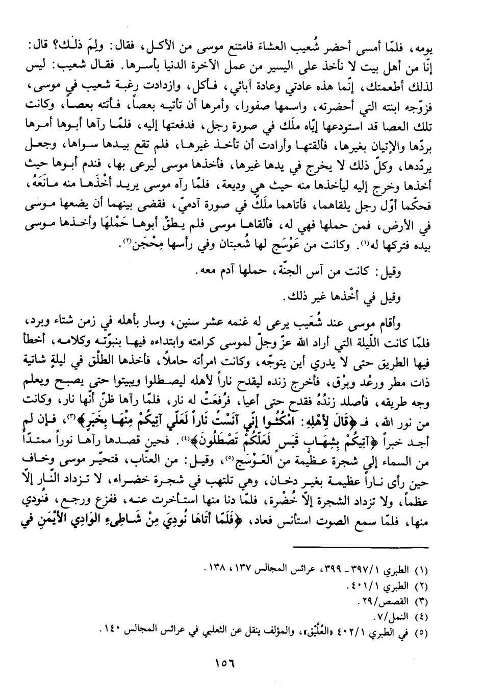 وَأَقَامَ مُوسَى عِنْدَ شُعَيْبٍ يَرْعَى لَهُ غَنَمَهُ عَشْرَ سِنِينَ، وَسَارَ بِأَهْلِهِ فِي زَمَنِ شِتَاءٍ وَبَرْدٍ، فَلَمَّا كَانَتِ اللَّيْلَةُ الَّتِي أَرَادَ اللَّهُ - عَزَّ وَجَلَّ - لِمُوسَى كَرَامَتَهُ، وَابْتِدَاءَهُ فِيهَا بِنُبُوَّتِهِ، وَكَلَامِهِ أَخْطَأَ فِيهَا الطَّرِيقَ حَتَّى لَا يَدْرِيَ أَيْنَ يَتَوَجَّهُ، وَكَانَتِ امْرَأَتُهُ حَامِلًا، فَأَخَذَهَا الطَّلْقُ فِي لَيْلَةٍ شَاتِيَةٍ ذَاتِ مَطَرٍ، وَرَعْدٍ، وَبَرْقٍ، فَأَخْرَجَ زَنْدَهُ لِيَقْدَحَ نَارًا لِأَهْلِهِ لِيَصْطَلُوا وَيَبِيتُوا حَتَّى يُصْبِحَ وَيَعْلَمَ وَجْهَ طَرِيقِهِ، فَأَصْلَدَ زَنْدَهُ فَقَدَحَ حَتَّى أَعْيَا، فَرُفِعَتْ لَهُ نَارٌ، فَلَمَّا رَآهَا ظَنَّ أَنَّهَا نَارٌ، وَكَانَتْ مِنْ نُورِ اللَّهِ، فَـ {قَالَ لِأَهْلِهِ امْكُثُوا إِنِّي آنَسْتُ نَارًا لَعَلِّي آتِيكُمْ مِنْهَا بِخَبَرٍ} [القصص: 29] ، فَإِنْ لَمْ أَجِدْ خَبَرًا {آتِيكُمْ بِشِهَابٍ قَبَسٍ لَعَلَّكُمْ تَصْطَلُونَ} [النمل: 7] . فَحِينَ قَصَدَهَا رَآهَا نُورًا مُمْتَدًّا مِنَ السَّمَاءِ إِلَى شَجَرَةٍ عَظِيمَةٍ مِنَ الْعَوْسَجِ، وَقِيلَ مِنَ الْعُنَّابِ، فَتَحَيَّرَ مُوسَى وَخَافَ حِينَ رَأَى نَارًا عَظِيمَةً بِغَيْرِ دُخَانٍ وَهِيَ تَلْتَهِبُ فِي شَجَرَةٍ خَضْرَاءَ لَا تَزْدَادُ النَّارُ إِلَّا عِظَمًا، وَلَا تَزْدَادُ الشَّجَرَةُ إِلَّا خُضْرَةً، فَلَمَّا دَنَا مِنْهَا اسْتَأْخَرَتْ عَنْهُ، فَفَزِعَ وَرَجَعَ، فَنُودِيَ مِنْهَا، فَلَمَّا سَمِعَ الصَّوْتَ اسْتَأْنَسَ فَعَادَ، {فَلَمَّا أَتَاهَا نُودِيَ مِنْ شَاطِئِ الْوَادِي الْأَيْمَنِ فِي الْبُقْعَةِ الْمُبَارَكَةِ مِنَ الشَّجَرَةِ} [القصص: 30] .