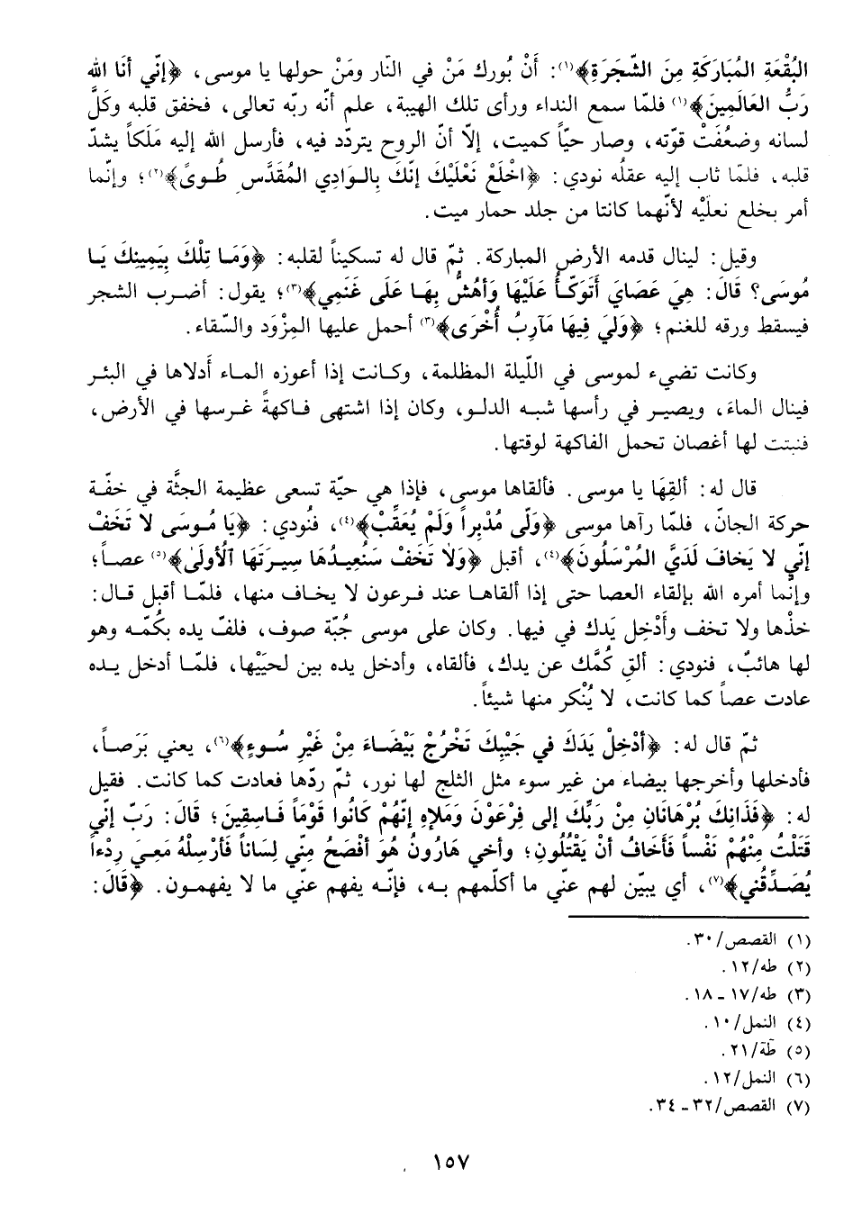 {أَنْ بُورِكَ مَنْ فِي النَّارِ وَمَنْ حَوْلَهَا - يَامُوسَى إِنِّي أَنَا اللَّهُ رَبُّ الْعَالَمِينَ} [القصص: 8 - 30] ، فَلَمَّا سَمِعَ النِّدَاءَ وَرَأَى تِلْكَ الْهَيْبَةَ عَلِمَ أَنَّهُ رَبُّهُ تَعَالَى، فَخَفَقَ قَلْبُهُ وَكَلَّ لِسَانُهُ، وَضَعُفَتْ قُوَّتُهُ، وَصَارَ حَيًّا كَمَيِّتٍ إِلَّا أَنَّ الرُّوحَ يَتَرَدَّدُ فِيهِ، فَأَرْسَلَ اللَّهُ إِلَيْهِ مَلَكًا يَشُدُّ قَلْبَهُ، فَلَمَّا ثَابَ إِلَيْهِ عَقْلُهُ نُودِيَ: {فَاخْلَعْ نَعْلَيْكَ إِنَّكَ بِالْوَادِي الْمُقَدَّسِ طُوًى} [طه: 12] ، وَإِنَّمَا أُمِرَ بِخَلْعِ نَعْلَيْهِ لِأَنَّهُمَا كَانَتَا مِنْ جِلْدِ حِمَارٍ مَيِّتٍ، وَقِيلَ: لِيَنَالَ قَدَمُهُ الْأَرْضَ الْمُبَارَكَةَ، ثُمَّ قَالَ لَهُ تَسْكِينًا لِقَلْبِهِ: {وَمَا تِلْكَ بِيَمِينِكَ يَامُوسَى - قَالَ هِيَ عَصَايَ أَتَوَكَّأُ عَلَيْهَا وَأَهُشُّ بِهَا عَلَى غَنَمِي} [طه: 17 - 18] ، يَقُولُ: أَضْرِبُ الشَّجَرَ فَيَسْقُطُ وَرَقُهُ لِلْغَنَمِ، {وَلِيَ فِيهَا مَآرِبُ أُخْرَى} [طه: 18] أَحْمِلُ عَلَيْهَا الْمِزْوَدَ وَالسِّقَاءَ.