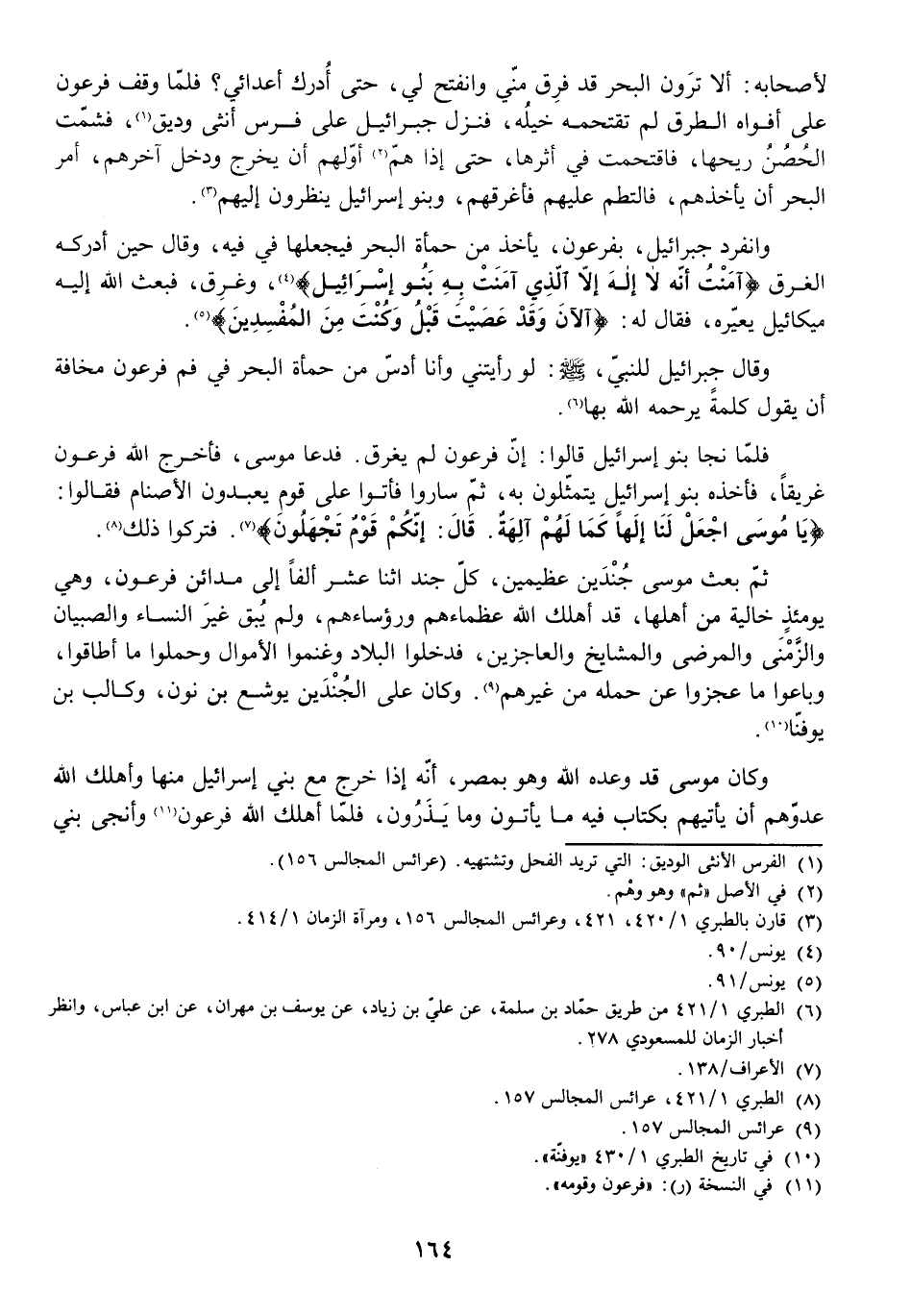لِأَصْحَابِهِ: أَلَا تَرَوْنَ الْبَحْرَ قَدْ فَرَقَ مِنِّي وَانْفَتَحَ لِي حَتَّى أُدْرِكَ أَعْدَائِي؟ فَلَمَّا وَقَفَ فِرْعَوْنُ عَلَى أَفْوَاهِ الطُّرُقِ لَمْ تَقْتَحِمْهُ خَيْلُهُ، فَنَزَلَ جَبْرَائِيلُ عَلَى فَرَسٍ أُنْثَى وَدِيقٍ، فَشَمَّتَ الْحُصُنُ رِيحَهَا فَاقْتَحَمَتْ فِي أَثَرِهَا حَتَّى إِذَا هَمَّ أَوَّلُهُمْ أَنْ يَخْرُجَ وَدَخَلَ آخِرُهُمْ أُمِرَ الْبَحْرُ أَنْ يَأْخُذَهُمْ فَالْتَطَمَ عَلَيْهِمْ فَأَغْرَقَهُمْ، وَبَنُو إِسْرَائِيلَ يَنْظُرُونَ إِلَيْهِمْ.
