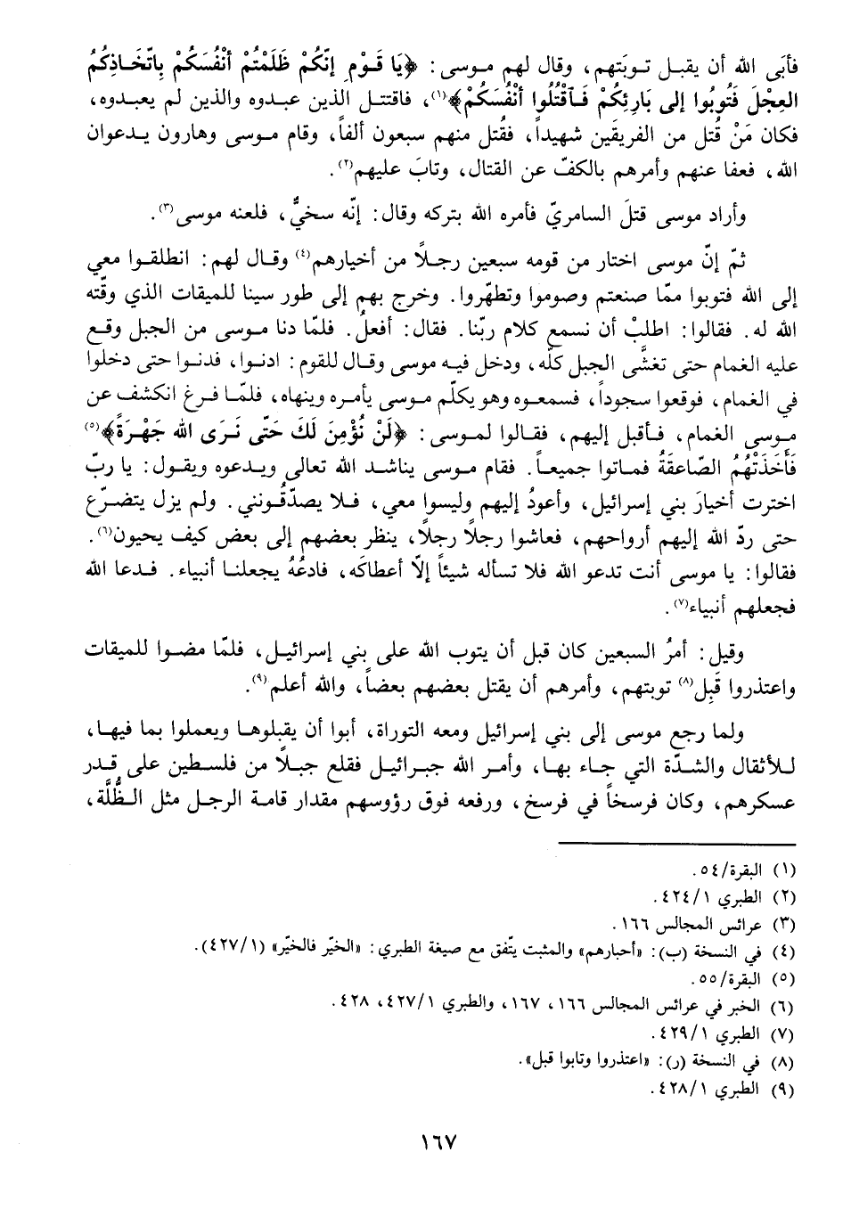 ثُمَّ إِنَّ مُوسَى اخْتَارَ مِنْ قَوْمِهِ سَبْعِينَ رَجُلًا مِنْ أَخْيَارِهِمْ، وَقَالَ لَهُمُ: انْطَلِقُوا مَعِي إِلَى اللَّهِ فَتُوبُوا مِمَّا صَنَعْتُمْ، وَصُومُوا، وَتَطَهَّرُوا. وَخَرَجَ بِهِمْ إِلَى طُورِ سِينَا لِلْمِيقَاتِ الَّذِي وَقَّتَهُ اللَّهُ لَهُ. فَقَالُوا: اطْلُبْ أَنْ نَسْمَعَ كَلَامَ رَبِّنَا، فَقَالَ: أَفْعَلُ. فَلَمَّا دَنَا مُوسَى مِنَ الْجَبَلِ وَقَعَ عَلَيْهِ الْغَمَامُ حَتَّى تَغَشَّى الْجَبَلَ كُلَّهُ وَدَخَلَ فِيهِ مُوسَى، وَقَالَ لِلْقَوْمِ: ادْنُوا، فَدَنَوْا حَتَّى دَخَلُوا فِي الْغَمَامِ، فَوَقَعُوا سُجُودًا، فَسَمِعُوهُ وَهُوَ يُكَلِّمُ مُوسَى يَأْمُرُهُ وَيَنْهَاهُ، فَلَمَّا فَرَغَ انْكَشَفَ عَنْ مُوسَى الْغَمَامُ، فَأَقْبَلَ إِلَيْهِمْ، فَقَالُوا لِمُوسَى: {لَنْ نُؤْمِنَ لَكَ حَتَّى نَرَى اللَّهَ جَهْرَةً} [البقرة: 55] فَأَخَذَتْهُمُ الصَّاعِقَةُ فَمَاتُوا جَمِيعًا. فَقَامَ مُوسَى يُنَاشِدُ اللَّهَ تَعَالَى وَيَدْعُوهُ وَيَقُولُ: يَا رَبِّ، اخْتَرْتُ أَخْيَارَ بَنِي إِسْرَائِيلَ وَأَعُودُ إِلَيْهِمْ وَلَيْسُوا مَعِي فَلَا يُصَدِّقُونَنِي. وَلَمْ يَزَلْ يَتَضَرَّعُ حَتَّى رَدَّ اللَّهُ إِلَيْهِمْ أَرْوَاحَهُمْ فَعَاشُوا رَجُلًا رَجُلًا يَنْظُرُ بَعْضُهُمْ إِلَى بَعْضٍ كَيْفَ يَحْيَوْنَ. فَقَالُوا: يَا مُوسَى أَنْتَ تَدْعُو اللَّهَ فَلَا تَسْأَلُهُ شَيْئًا إِلَّا أَعْطَاكَهُ، فَادْعُهُ يَجْعَلُنَا أَنْبِيَاءَ. فَدَعَا اللَّهَ فَجَعَلَهُمْ أَنْبِيَاءَ.