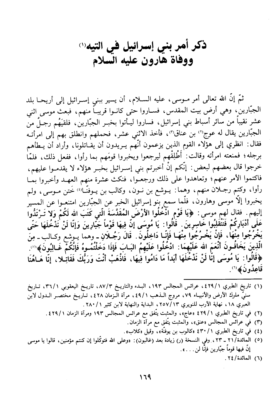 ثُمَّ إِنَّ اللَّهَ تَعَالَى أَمَرَ مُوسَى - عَلَيْهِ السَّلَامُ - أَنْ يَسِيرَ بِبَنِي إِسْرَائِيلَ إِلَى أَرِيحَا بَلَدِ الْجَبَّارِينَ، وَهِيَ أَرْضُ بَيْتِ الْمَقْدِسِ، فَسَارُوا حَتَّى كَانُوا قَرِيبًا مِنْهُمْ، فَبَعَثَ مُوسَى اثْنَيْ عَشَرَ نَقِيبًا مِنْ سَائِرِ أَسْبَاطِ بَنِي إِسْرَائِيلَ، فَسَارُوا لِيَأْتُوا بِخَبَرِ الْجَبَّارِينَ، فَلَقِيَهُمْ رَجُلٌ مِنَ الْجَبَّارِينَ يُقَالُ لَهُ عَوْجُ بْنُ عِنَاقٍ فَأَخَذَ الِاثْنَيْ عَشَرَ فَحَمَلَهُمْ وَانْطَلَقَ بِهِمْ إِلَى امْرَأَتِهِ فَقَالَ: انْظُرِي إِلَى هَؤُلَاءِ الْقَوْمِ الَّذِينَ يَزْعُمُونَ أَنَّهُمْ يُرِيدُونَ أَنْ يَقْتُلُونَا، وَأَرَادَ أَنْ يَطَأَهُمْ بِرِجْلِهِ، فَمَنَعَتْهُ امْرَأَتُهُ، وَقَالَتْ: أَطْلِقْهُمْ لِيَرْجِعُوا وَيُخْبِرُوا قَوْمَهُمْ بِمَا رَأَوْا، فَفَعَلَ ذَلِكَ، فَلَمَّا خَرَجُوا قَالَ بَعْضُهُمْ لِبَعْضٍ: إِنَّكُمْ إِنْ أَخْبَرْتُمْ بَنِي إِسْرَائِيلَ بِخَبَرِ هَؤُلَاءِ لَا يَقْدَمُوا عَلَيْهِمْ، فَاكْتُمُوا الْأَمْرَ عَنْهُمْ، وَتَعَاهَدُوا عَلَى ذَلِكَ وَرَجَعُوا، فَنَكَثَ عَشَرَةٌ مِنْهُمُ الْعَهْدَ وَأَخْبَرُوا بِمَا رَأَوْا، وَكَتَمَ رَجُلَانِ مِنْهُمْ، وَهَمَا: يُوشَعُ بْنُ نُونٍ، وَكَالَبُ بْنُ يُوفَنَّا خَتَنُ مُوسَى، وَلَمْ يُخْبِرُوا إِلَّا مُوسَى وَهَارُونَ، فَلَمَّا سَمِعَ بَنُو إِسْرَائِيلَ الْخَبَرَ عَنِ الْجَبَّارِينَ امْتَنَعُوا عَنِ الْمَسِيرِ إِلَيْهِمْ. فَقَالَ لَهُمْ مُوسَى: {يَاقَوْمِ ادْخُلُوا الْأَرْضَ الْمُقَدَّسَةَ الَّتِي كَتَبَ اللَّهُ لَكُمْ وَلَا تَرْتَدُّوا عَلَى أَدْبَارِكُمْ فَتَنْقَلِبُوا خَاسِرِينَ - قَالُوا يَامُوسَى إِنَّ فِيهَا قَوْمًا جَبَّارِينَ وَإِنَّا لَنْ نَدْخُلَهَا حَتَّى يَخْرُجُوا مِنْهَا فَإِنْ يَخْرُجُوا مِنْهَا فَإِنَّا دَاخِلُونَ - قَالَ رَجُلَانِ} [المائدة: 21 - 23]- وَهُمَا يُوشَعُ، وَكَالَبُ - {مِنَ الَّذِينَ يَخَافُونَ أَنْعَمَ اللَّهُ عَلَيْهِمَا ادْخُلُوا عَلَيْهِمُ الْبَابَ فَإِذَا دَخَلْتُمُوهُ فَإِنَّكُمْ غَالِبُونَ - قَالُوا يَامُوسَى إِنَّا لَنْ نَدْخُلَهَا أَبَدًا مَا دَامُوا فِيهَا فَاذْهَبْ أَنْتَ وَرَبُّكَ فَقَاتِلَا إِنَّا هَاهُنَا قَاعِدُونَ} [المائدة: 23 - 24] .