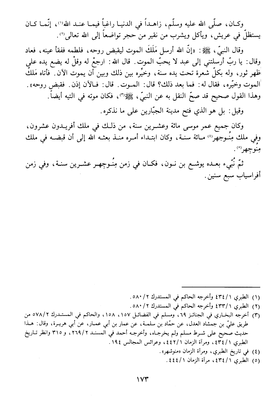 وَكَانَ جَمِيعُ عُمُرِ مُوسَى مِائَةً وَعِشْرِينَ سَنَةً، مِنْ ذَلِكَ فِي مُلْكِ أَفْرِيدُونَ عِشْرُونَ، وَفِي مُلْكِ مِنُوجِهْرَ مِائَةُ سَنَةٍ، وَكَانَ ابْتِدَاءُ أَمْرِهِ مُنْذُ بَعَثَهُ اللَّهُ إِلَى أَنْ قَبَضَهُ فِي مُلْكِ مِنُوجِهْرَ.