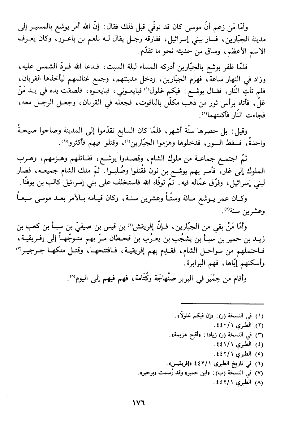 وَأَمَّا مَنْ بَقِيَ مِنَ الْجَبَّارِينَ فَإِنَّ إِفْرِيقِشَ بْنَ قَيْسِ بْنِ صَيْفِيِّ بْنِ سَبَإِ بْنِ كَعْبِ بْنِ زَيْدِ بْنِ حِمْيَرَ بْنِ سَبَإِ بْنِ يَشْجُبَ بْنِ يَعْرُبَ بْنِ قَحْطَانَ مَرَّ بِهِمْ مُتَوَجِّهًا إِلَى إِفْرِيقِيَّةَ فَاحْتَمَلَهُمْ مِنْ سَوَاحِلِ الشَّامِ فَقَدِمَ بِهِمْ إِفْرِيقِيَّةَ فَافْتَتَحَهَا، وَقَتَلَ مَلِكَهُ جُرْجِيرَ، وَأَسْكَنَهُمْ إِيَّاهَا، فَهُمُ الْبَرَابِرَةُ. وَأَقَامَ مِنْ حِمْيِرَ فِي الْبَرْبَرِ صَنْهَاجَةُ وَكُتَامَةُ، فَهُمْ فِيهِمْ إِلَى الْيَوْمِ.