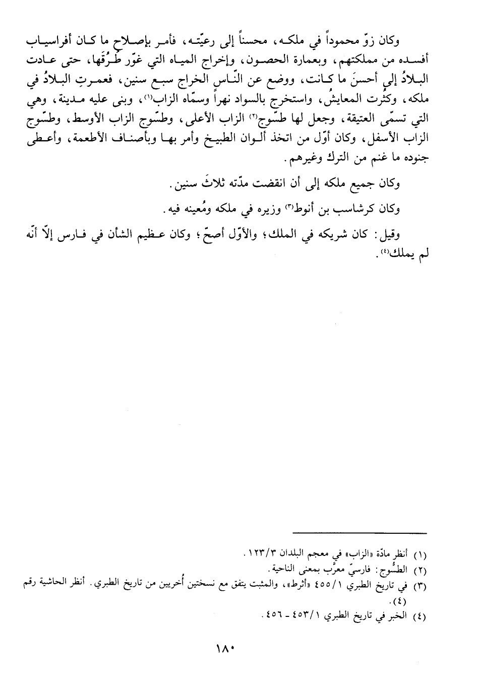 وَكَانَ زَوٌّ مَحْمُودًا فِي مُلْكِهِ مُحْسِنًا إِلَى رَعِيَّتِهِ فَأَمَرَ بِإِصْلَاحِ مَا كَانَ أَفَرْسِيَابُ أَفْسَدَهُ مِنْ مَمْلَكَتِهِمْ، وَبِعِمَارَةِ الْحُصُونِ، وَإِخْرَاجِ الْمِيَاهِ الَّتِي غَوَّرَ طُرُقَهَا، حَتَّى عَادَتِ الْبِلَادُ إِلَى أَحْسَنِ مَا كَانَتْ. وَوَضَعَ عَنِ النَّاسِ الْخَرَاجَ سَبْعَ سِنِينَ، فَعَمُرَتِ الْبِلَادُ فِي مُلْكِهِ وَكَثُرَتِ الْمَعَايِشُ، وَاسْتَخْرَجَ بِالسَّوَادِ نَهْرًا وَسَمَّاهُ الزَّابَ، وَبَنَى عَلَيْهِ مَدِينَةً وَهِيَ الَّتِي تُسَمَّى الْعَتِيقَةَ، وَجَعَلَ لَهَا طَسُّوجَ الزَّابِ الْأَعْلَى، وَطَسُّوجَ الزَّابِ الْأَوْسَطِ، وَطَسُّوجَ الزَّابِ الْأَسْفَلِ، وَكَانَ أَوَّلَ مَنِ اتَّخَذَ أَلْوَانَ الطَّبِيخِ وَأَمَرَ بِهَا وَبِأَصْنَافِ الْأَطْعِمَةِ، وَأَعْطَى جُنُودَهُ مَا غَنِمَ مِنَ التُّرْكِ وَغَيْرِهِمْ.