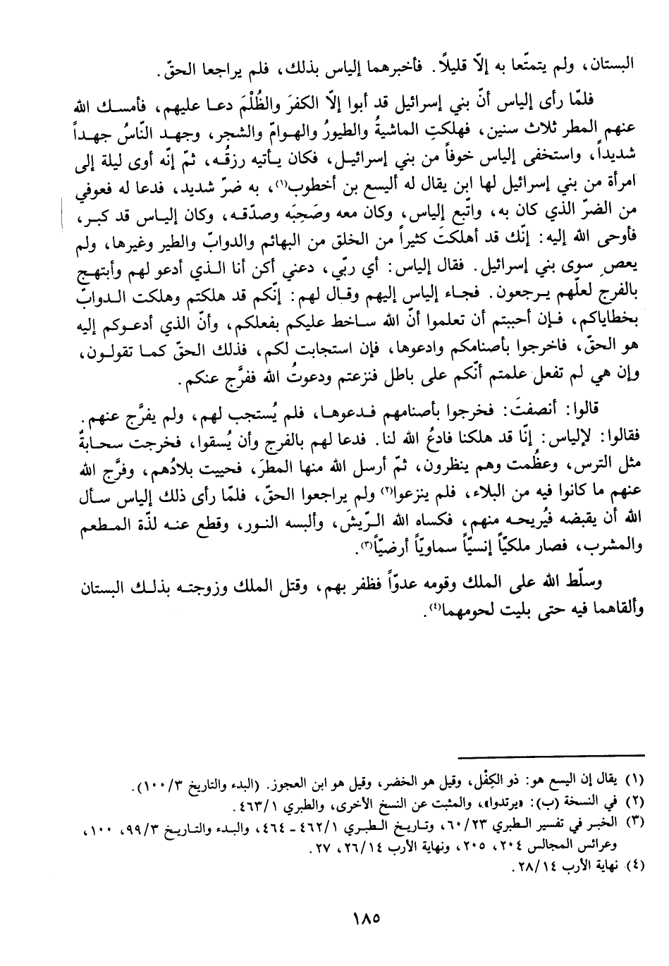 قَالُوا: أَنْصَفْتَ. فَخَرَجُوا بِأَصْنَامِهِمْ فَدَعَوْهَا فَلَمْ تَسْتَجِبْ لَهُمْ، وَلَمْ يُفَرَّجْ عَنْهُمْ. فَقَالُوا لِإِلْيَاسَ: إِنَّا قَدْ هَلَكْنَا فَادْعُ اللَّهَ لَنَا. فَدَعَا لَهُمْ بِالْفَرَجِ وَأَنْ يُسْقَوْا، فَخَرَجَتْ سَحَابَةٌ مِثْلُ التُّرْسِ، وَعَظُمَتْ وَهُمْ يَنْظُرُونَ، ثُمَّ أَرْسَلَ اللَّهُ مِنْهَا الْمَطَرَ، فَحَيِيَتْ بِلَادُهُمْ، وَفَرَّجَ اللَّهُ عَنْهُمْ مَا كَانُوا فِيهِ مِنَ الْبَلَاءِ، فَلَمْ يَنْزِعُوا وَلَمْ يُرَاجِعُوا الْحَقَّ، فَلَمَّا رَأَى ذَلِكَ إِلْيَاسُ سَأَلَ اللَّهَ أَنْ يَقْبِضَهُ فَيُرِيحَهُ مِنْهُمْ، فَكَسَاهُ اللَّهُ الرِّيشَ وَأَلْبَسَهُ النُّورَ، وَقَطَعَ عَنْهُ لَذَّةَ الْمَطْعَمِ وَالْمَشْرَبِ، فَصَارَ مَلَكِيًّا إِنْسِيًّا سَمَاوِيًّا أَرْضِيًّا، وَسَلَّطَ اللَّهُ عَلَى الْمَلِكِ وَقَوْمِهِ عَدُوًّا فَظَفِرَ بِهِمْ، وَقَتَلَ الْمَلِكَ وَزَوْجَتَهُ بِذَلِكَ الْبُسْتَانِ وَأَلْقَاهُمَا فِيهِ حَتَّى بَلِيَتْ لُحُومُهُمَا.