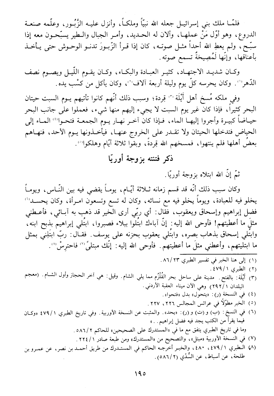 فَلَمَّا مَلَكَ بَنِي إِسْرَائِيلَ جَعَلَهُ اللَّهُ نَبِيًّا وَمَلِكًا، وَأَنْزَلَ عَلَيْهِ الزَّبُورَ، وَعَلَّمَهُ صَنْعَةَ الدُّرُوعِ، وَهُوَ أَوَّلُ مَنْ عَمِلَهَا، وَأَلَانَ لَهُ الْحَدِيدَ، وَأَمَرَ الْجِبَالَ وَالطَّيْرَ يُسَبِّحُونَ مَعَهُ إِذَا سَبَّحَ، وَلَمْ يُعْطِ اللَّهُ أَحَدًا مِثْلَ صَوْتِهِ، كَانَ إِذَا قَرَأَ الزَّبُورَ تَدْنُو الْوُحُوشُ حَتَّى يَأْخُذَ بِأَعْنَاقِهَا وَإِنَّهَا لَمُصِيخَةٌ تَسْمَعُ صَوْتَهُ.
