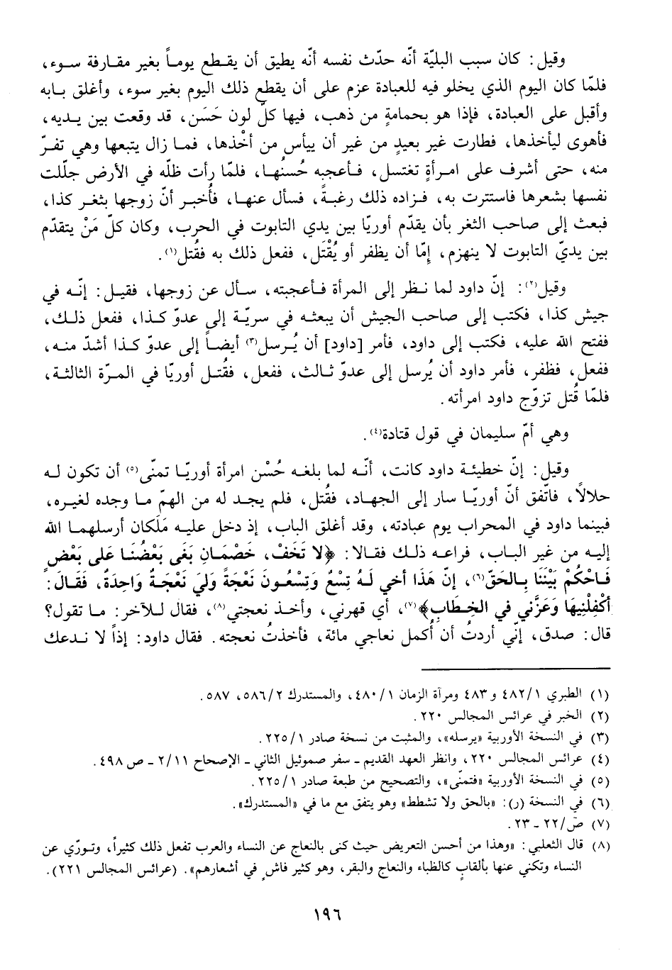 وَقِيلَ: إِنَّ خَطِيئَةَ دَاوُدَ كَانَتْ أَنَّهُ لَمَّا بَلَغَهُ حُسْنُ امْرَأَةِ أُورِيَّا تَمَنَّى أَنْ تَكُونَ لَهُ حَلَالًا، فَاتَّفَقَ أَنَّ أُورِيَّا سَارَ إِلَى الْجِهَادِ فَقُتِلَ فَلَمْ يَجِدْ لَهُ مِنَ الْهَمِّ مَا وَجَدَهُ لِغَيْرِهِ، فَبَيْنَمَا دَاوُدُ فِي الْمِحْرَابِ يَوْمَ عِبَادَتِهِ وَقَدْ أَغْلَقَ الْبَابَ إِذْ دَخَلَ عَلَيْهِ مَلَكَانِ أَرْسَلَهُمَا اللَّهُ إِلَيْهِ مِنْ غَيْرِ الْبَابِ، فَرَاعَهُ ذَلِكَ فَقَالَا: {لَا تَخَفْ خَصْمَانِ بَغَى بَعْضُنَا عَلَى بَعْضٍ فَاحْكُمْ بَيْنَنَا بِالْحَقِّ - إِنَّ هَذَا أَخِي لَهُ تِسْعٌ وَتِسْعُونَ نَعْجَةً وَلِيَ نَعْجَةٌ وَاحِدَةٌ فَقَالَ أَكْفِلْنِيهَا وَعَزَّنِي فِي الْخِطَابِ} [ص: 22 - 23] ، أَيْ قَهَرَنِي، وَأَخَذَ نَعْجَتِي، فَقَالَ لِلْآخَرِ: مَا تَقُولُ؟ قَالَ: صَدَقَ، إِنِّي أَرَدْتُ أَنْ أُكْمِلَ نِعَاجِي مِائَةً فَأَخَذْتُ نَعْجَتَهُ. فَقَالَ دَاوُدُ: إِذًا لَا نَدَعُكَ